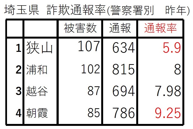 詐欺被害件数と、予兆電話を警察に通報して下さった数の比率『通報率』は、狭山署管内の被害がワーストなのに低く、他管内と最大1.57倍の開きがある。それを埋める為に具体的に協議しています。この『通報率』も向上されないと、詐欺被害もそれほど減りません。