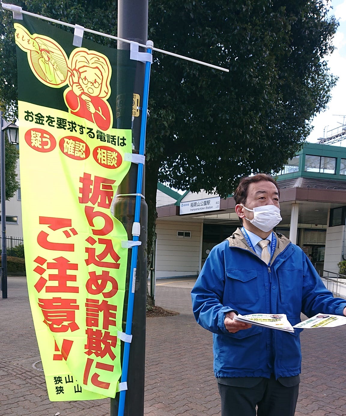 今朝(火)は3時間半、稲荷山公園駅で『詐欺・強盗防止』対策のお願い活動を行いました。詐欺被害にあった方から先ほどお話を伺い、公園内の方ともお話しました。
