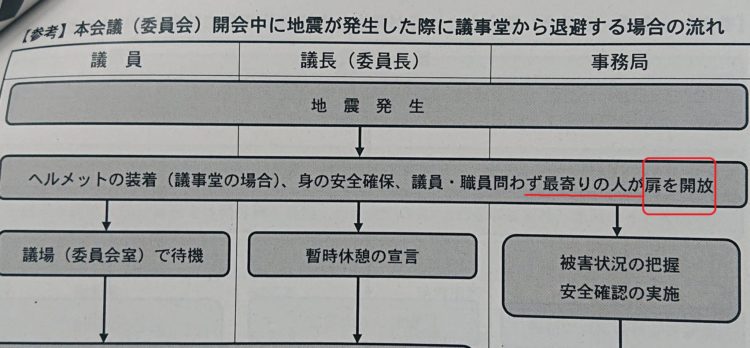 天井が高く・広い所は、天井板に地震時、力が集中して加わり、天井板が落ちる可能性がある事を、大地震時の新しい建物(例えば空港)の映像でご覧になった方が多いと思います。東日本大震災では、震源地から遠い都内のホールで死者が出ているので、(揺れている時に動いてケガをされる方が多いので細心の注意が必要ですが)動ける者が、担当制でなく、扉を開け、てんでんこ(自分での判断)で「(避難が必要だ)」と思えば、指示を待たずに避難する事が、大川小学校などこれまでの災害の教訓なので、⇩埼玉県議会の例で恐縮ですが、私が提案し、議長をはじめ賛同を得て、盛り込まれた部分を一例としてお伝えさせて頂きます。