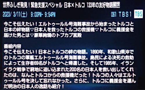 11日(土)📺TBS世界ふしぎ発見!『緊急支援スペシャル 日本×トルコ 133年の友好物語』夜9時~