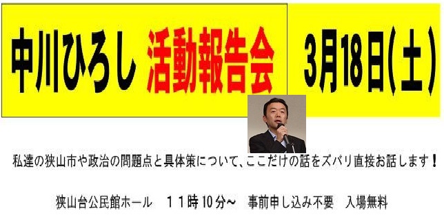 中川ひろし【県議会活動報告会】 3月18日(土) 11時10分~(開場11時)