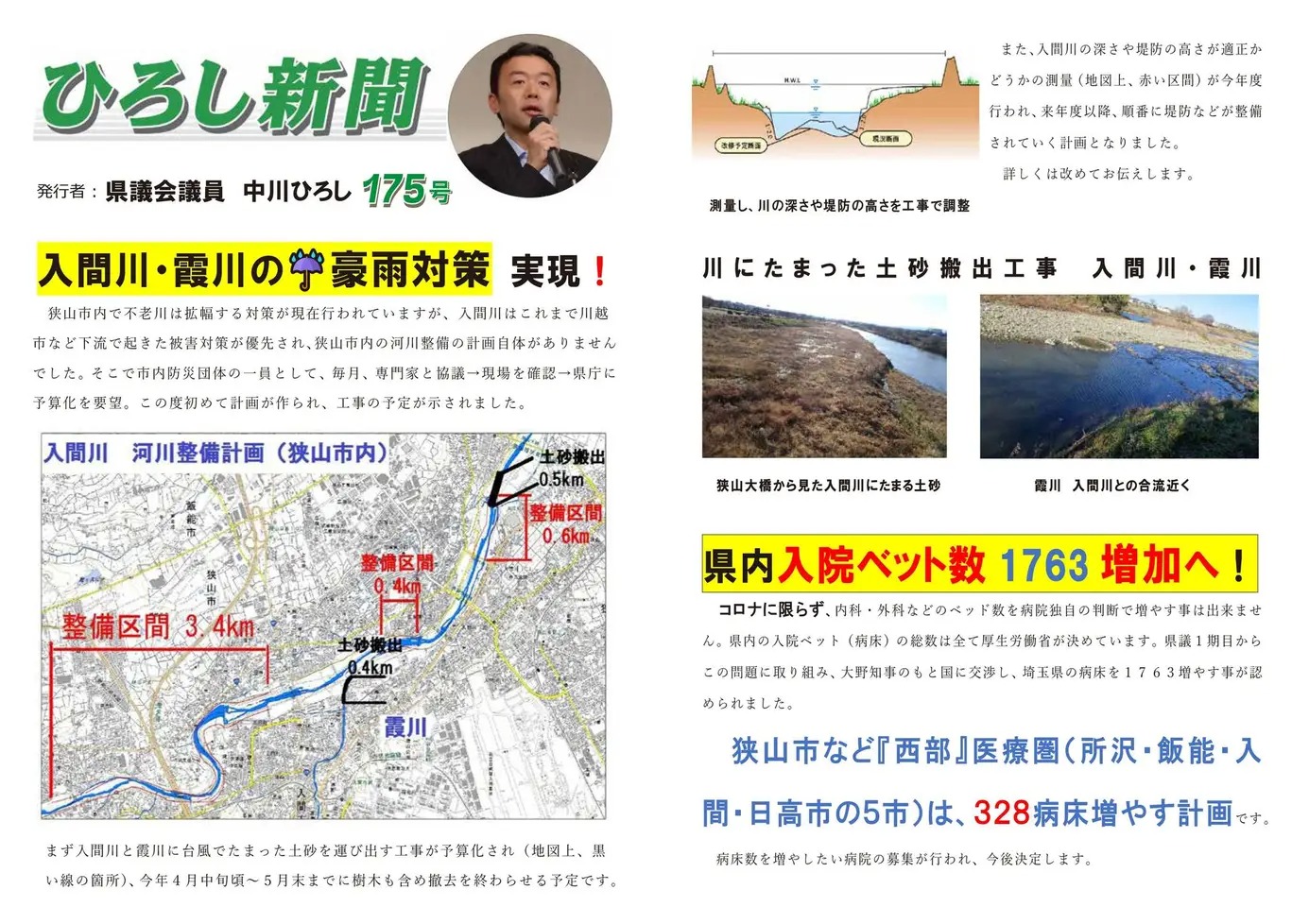 狭山市内の入間川・霞川の☔大雨・台風対策の【河川整備】は計画自体がこれまで全く作られた事が無く(工事が行われてもそれは『補修』で)、整備計画の策定を、私が所属する豪雨対策の市民団体とも一緒に県庁に求め続け、昨年初めて計画が作られました。土手を測量し、低い所は堤防として高くし、台風で土砂がたまった河川箇所は土砂を削る工事を行っていきます。