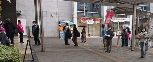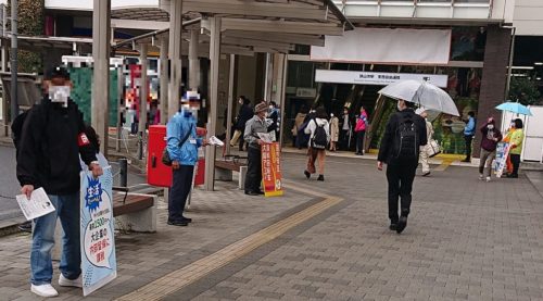 📷写真は、今朝(木)の駅前。私以外に他候補2陣営が合計16人居て、これでは通勤者から見て、マイナスではないでしょうか?