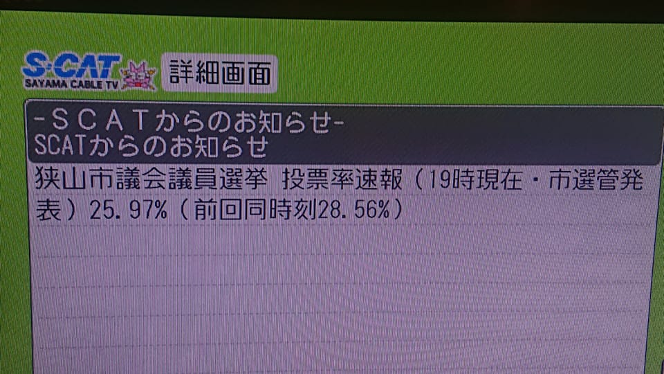 期日前が増えても、投票率は必ずしも上がりません。 (写真は狭山ケーブルTVのデータ放送)