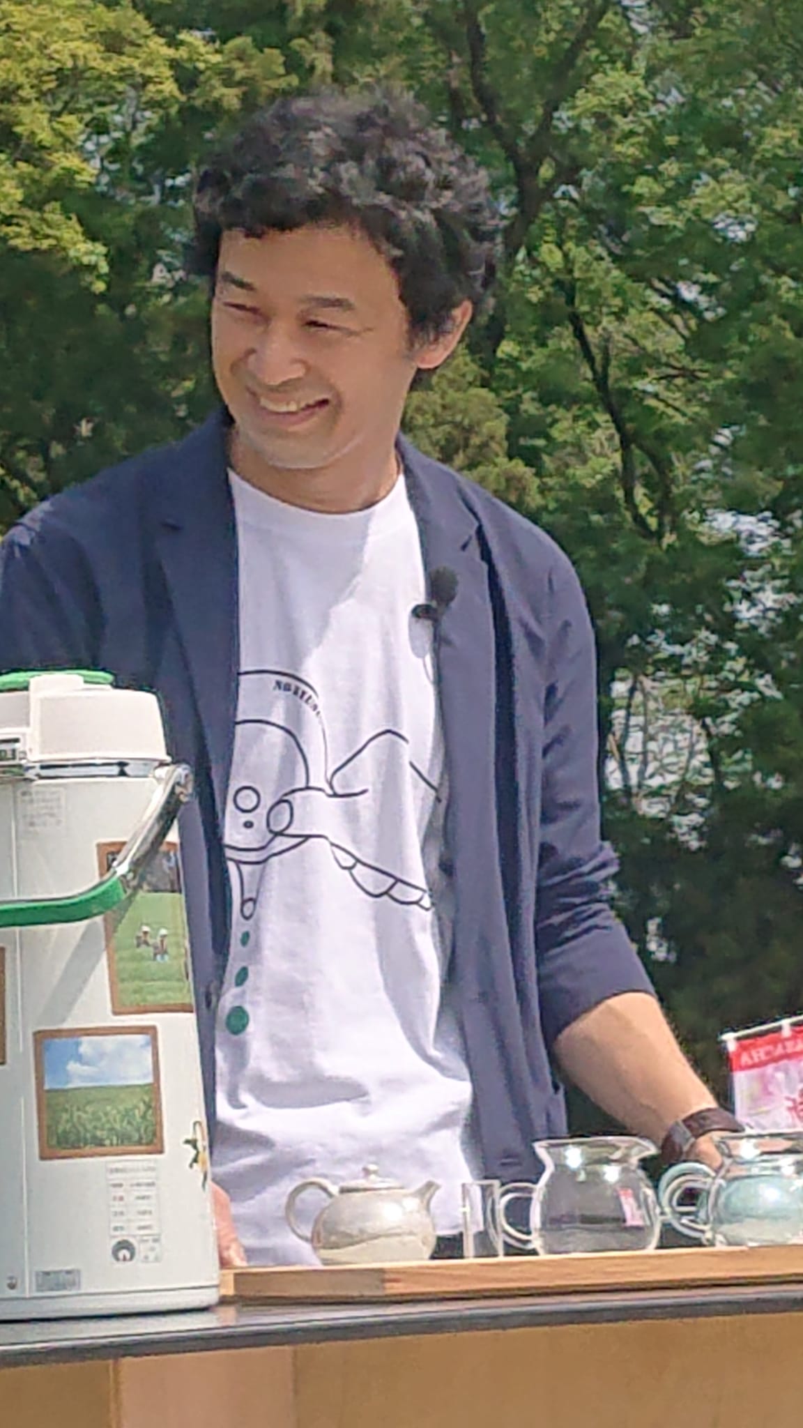 私が座っている位置からは、ポットの陰でTシャツが見えなかったので、(移動しづらい席でしたが)移動して撮りました。奥富さんらしい笑顔が撮れて良かった☺️。日本の以前からの生活文化を大事にしていきたいです。