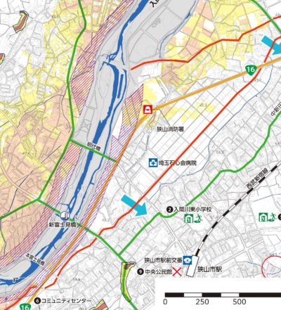 今回は、本富士見橋から『赤間川』沿いを通り、石心会病院・消防署までの間。現地確認をする必要性は、ハザードマップは5m間隔の高低差で作られており、用水路など細かな部分は反映されていないので、以前から各地区を住民の方にもお話を伺いながら、回っています。今後も行っていき、対策につなげていきます。
