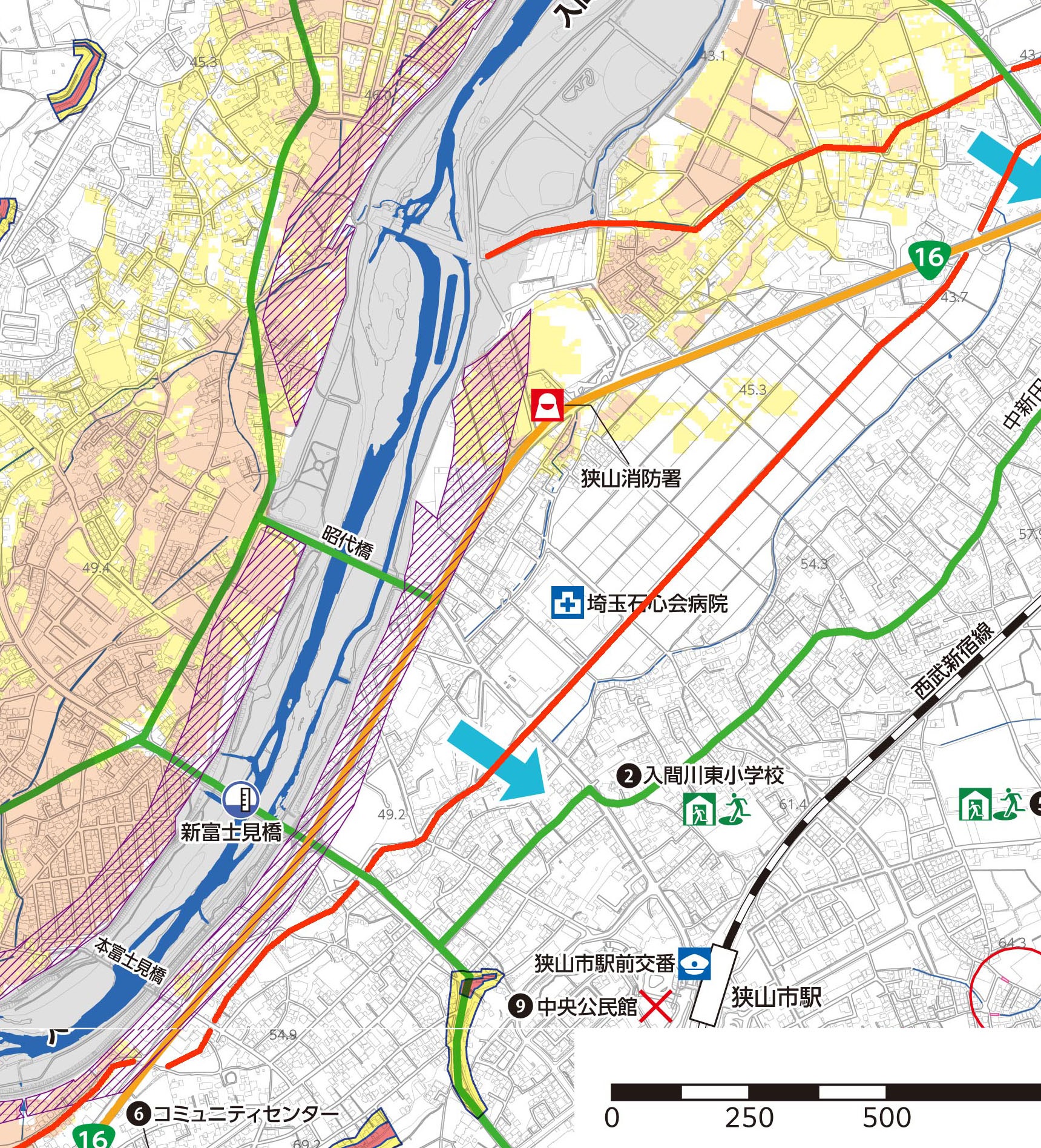 青矢印のクネクネしている線が、赤間川