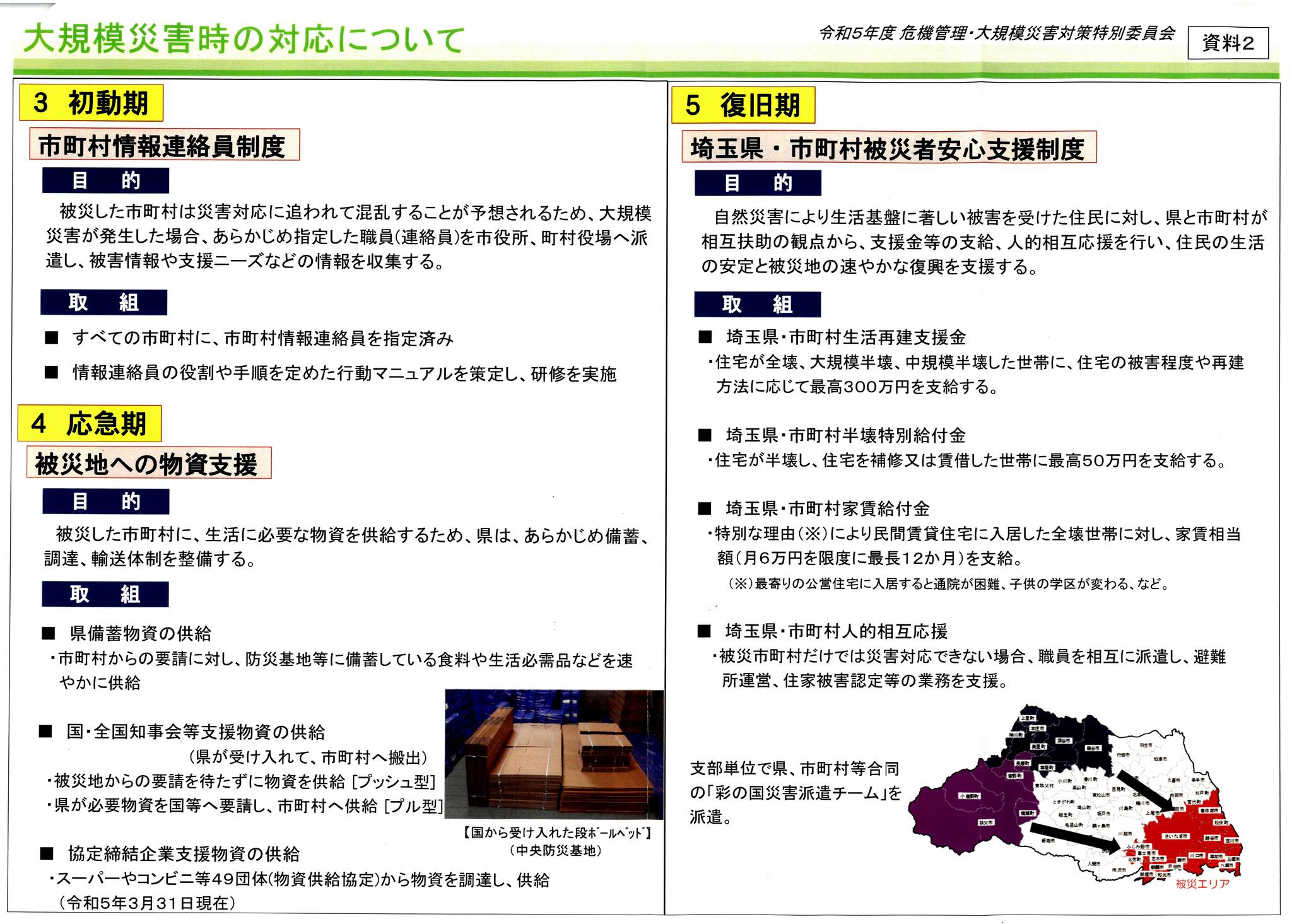 4年前の台風15号で64万戸が停電した千葉県。千葉市長(当時。現在の千葉県知事)から「県庁を通すとすぐ市町村と連携出来ないので、他市と直につながれるかどうかが、発災後2週間くらいまで重要」と聴いた事が強烈な印象として残っている私は、埼玉県庁職員が被災した市町村を応援する態勢について県議会の担当委員会で、改めて質問しました。
