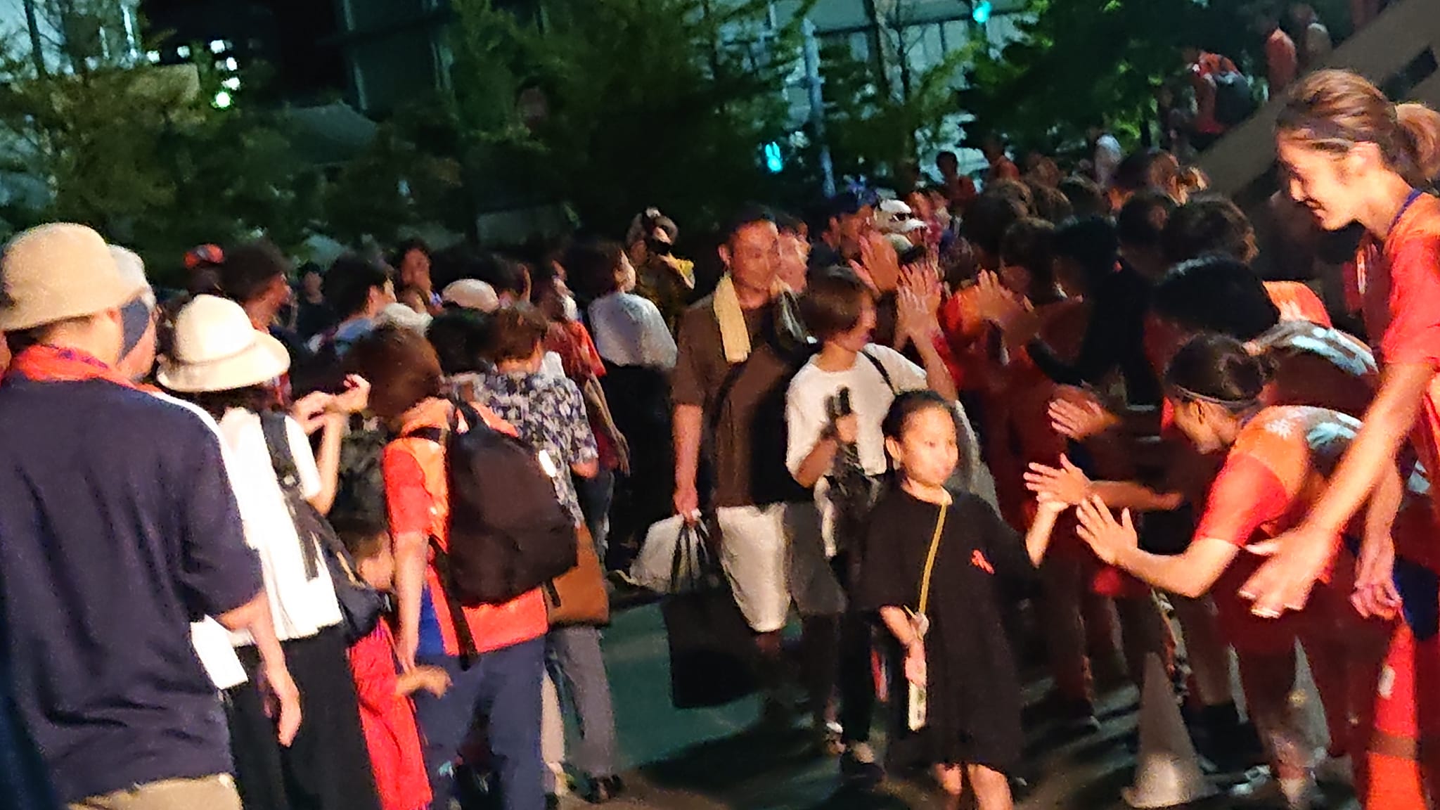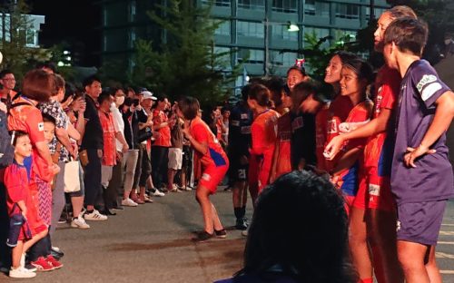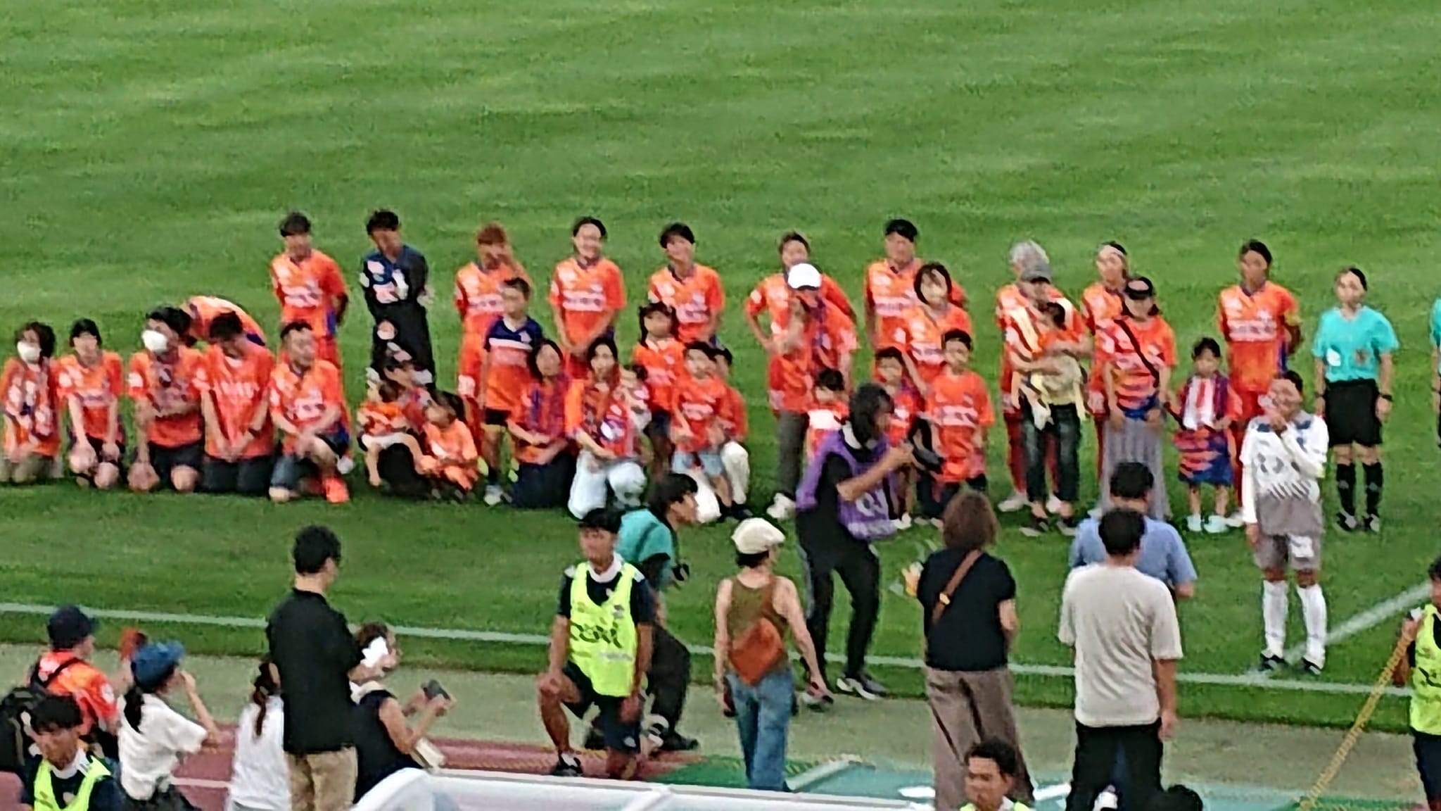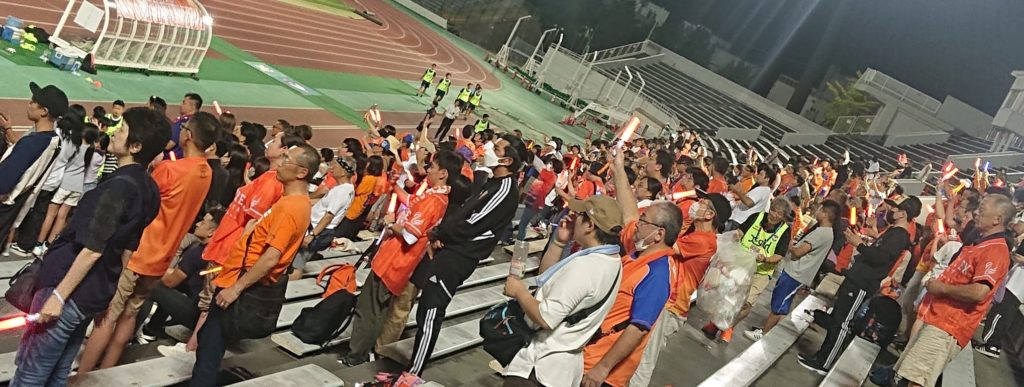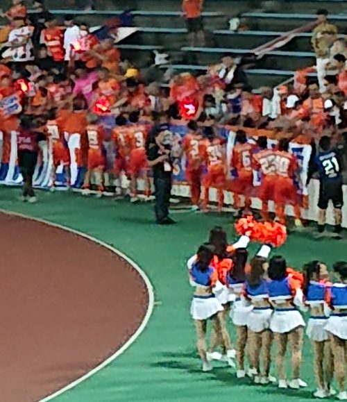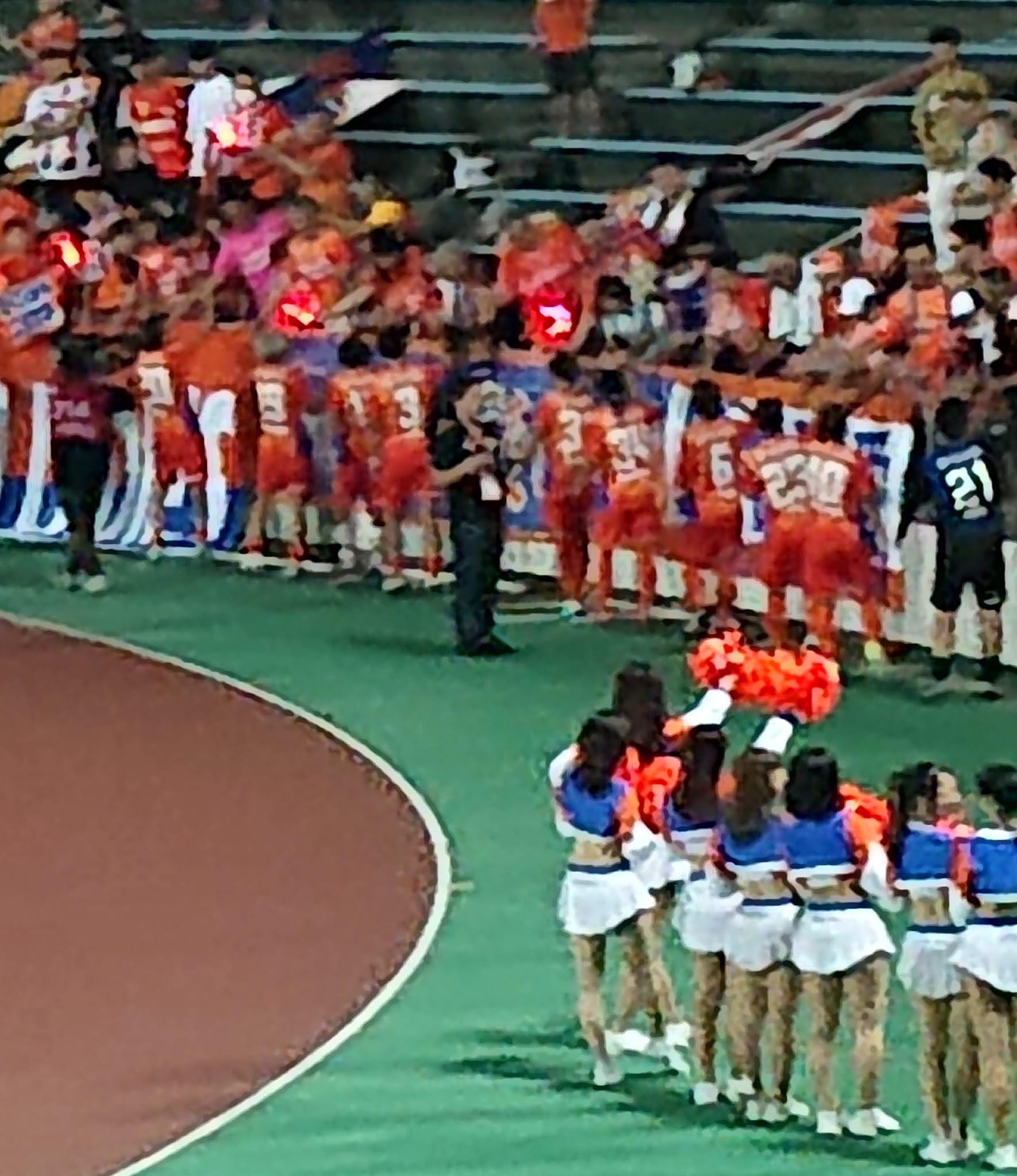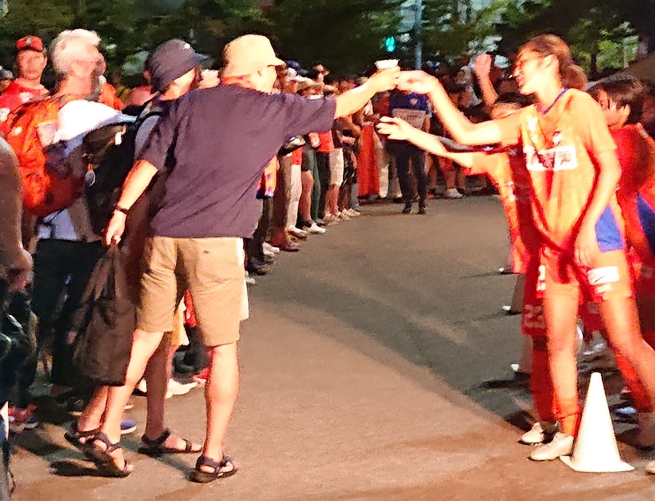 先ほどのハイタッチはスタジアムの外で行われたのですが、こちらは試合終了直後、ピッチと客席間でハイタッチ✋。選手は疲れてるけど、中々帰れない。逆に言うと、観客は試合が終わってからも長く楽しめる。