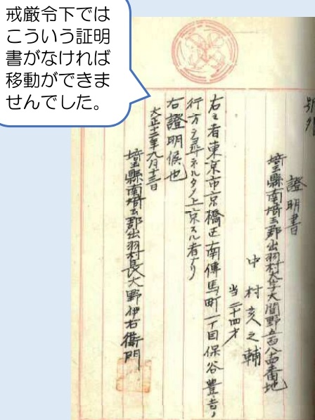 デマだって県庁は見抜けたはずだと思う1つの理由は⇩。証明書が無ければ、都市間の移動は許されなかった。なに人か聴く必要も無かった。でも県庁はデマを通達した。 (越谷市資料)