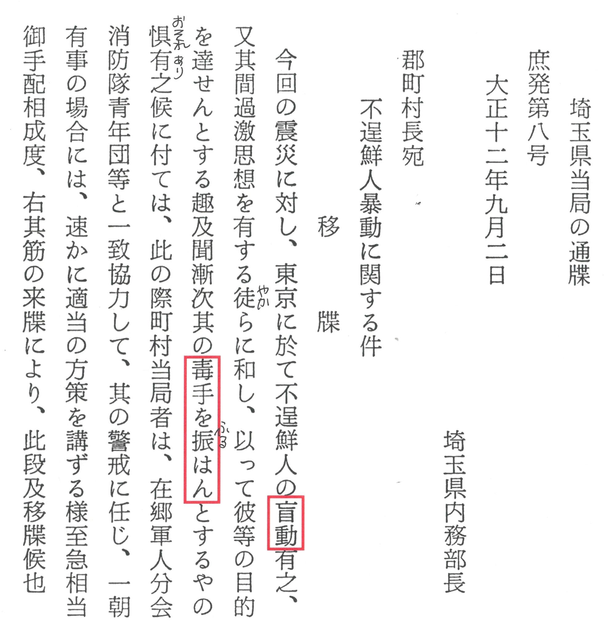 前述の📷関東大震災時、埼玉県庁が市町村に出してしまったデマの通達は文書だけでなく、他に電話でも伝えられました。