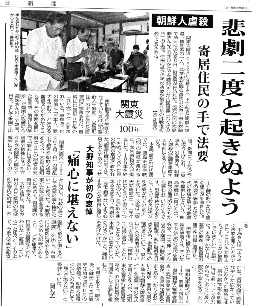 朝鮮人虐殺、本庄市主催の追悼式 市長「見直し不要」 イデオロギー持ち込まない /埼玉-毎日新聞