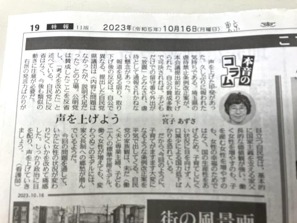 「右派の発言力ばかりが目立つ自民党は、基本的に国家主義を支える家父長的な価値観が強い。働く女性を増やすのも、子を産む女性を増やすのも、女性の幸福のためではなく、国の生産性を上げるため。子育てしにくい状況に目を向けず、人口減少による国力低下ばかりを恐れている。だから、今回のように、子育てがますます大変になるような条例改正案を平気で出してくる。〜中略〜家父長制への郷愁が潜んでいるようだ。」」