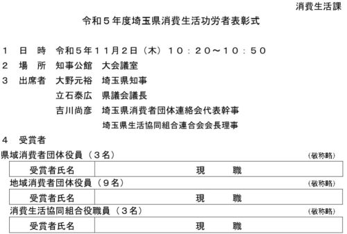 あさって(木)、県知事が、狭山市民を含め長年”消費者被害”の相談や、被害防止の講演活動で功績のあった15人を表彰すると今連絡があったので、代表者お1人くらいは「特に(消費者相談の中で)●●の分野でご尽力下さったと伺っております」と知事が述べられるように県職員から情報提供するよう、担当課長に話しました。
