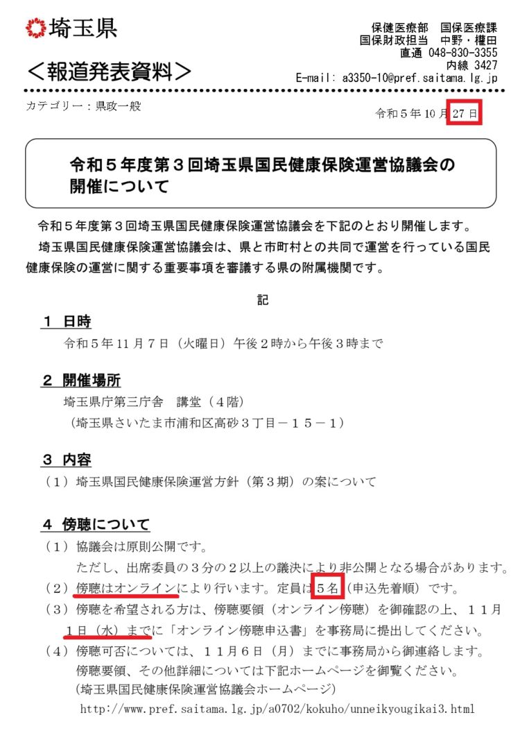 県庁は『虐待条例廃案』時、政策形成段階の情報が大事だと県議会にクレームを付けたが、6日後に迫った国民健康保険の審議会の資料を県庁は開示していない。更に、傍聴はオンラインのみで、5人のみ、更にわずか4日前に人知れず県庁のHPに入れてあって(報道発表といっても記者会見などしていないから、どこも報道していない)、もう申し込み期限を過ぎている。あきれては、いられず、改善を求めています。 虐待条例より、ひどくないですか?? (明日以降、県庁が改善次第報告します)