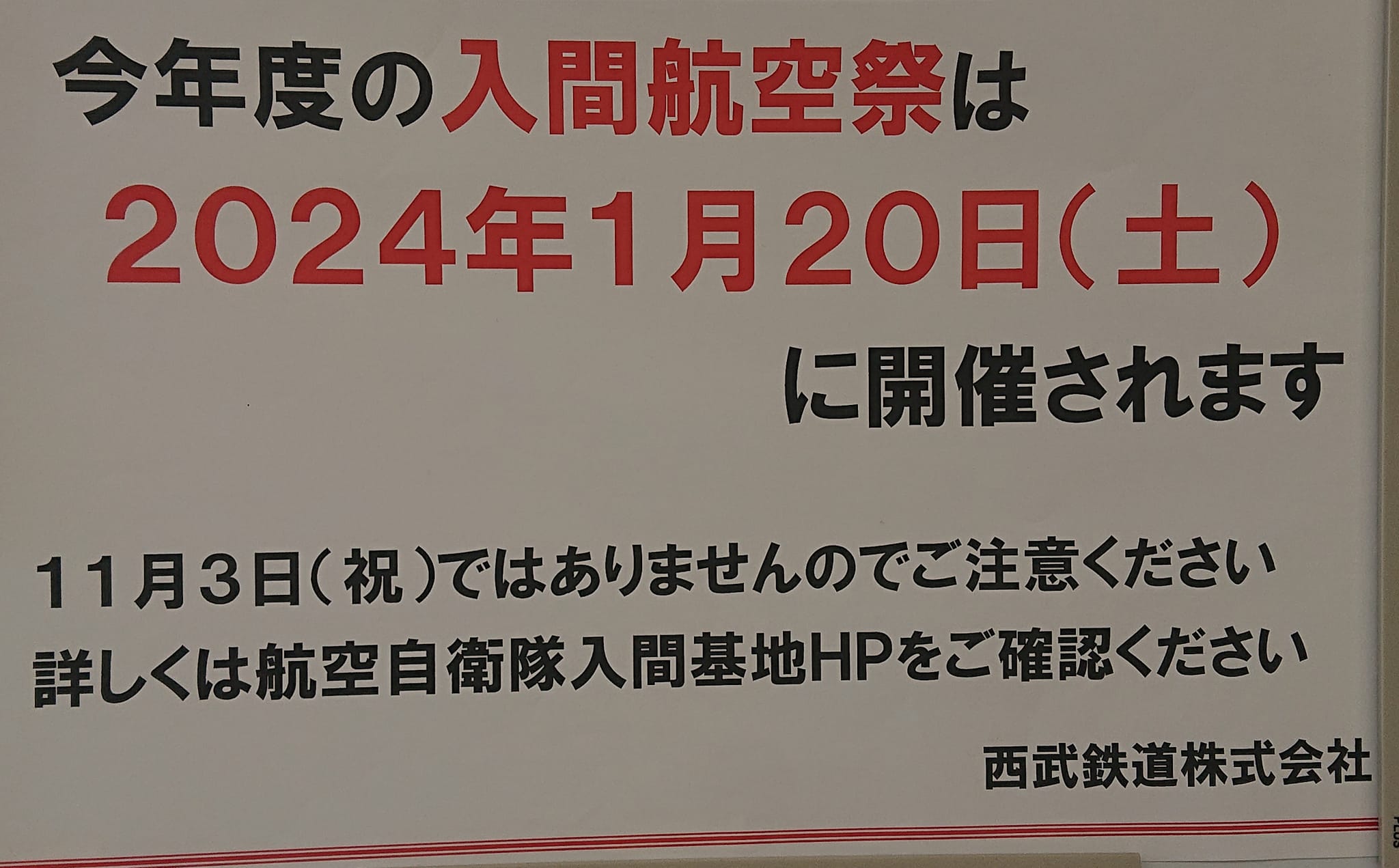晴れ日』ですが、来年1月20日(土)をお楽しみに。まだ日程が決まっていなかった時、基地司令(当時)が困っていました(政府が日程を決めたらしく)。📷️写真は狭山市駅の窓の✈️ブルーインパルス。私が通った時偶然、特急との📷️2ショットに。ちょっと🚃マニア向き?(^O^) 身内にはリアルなマニアがいます