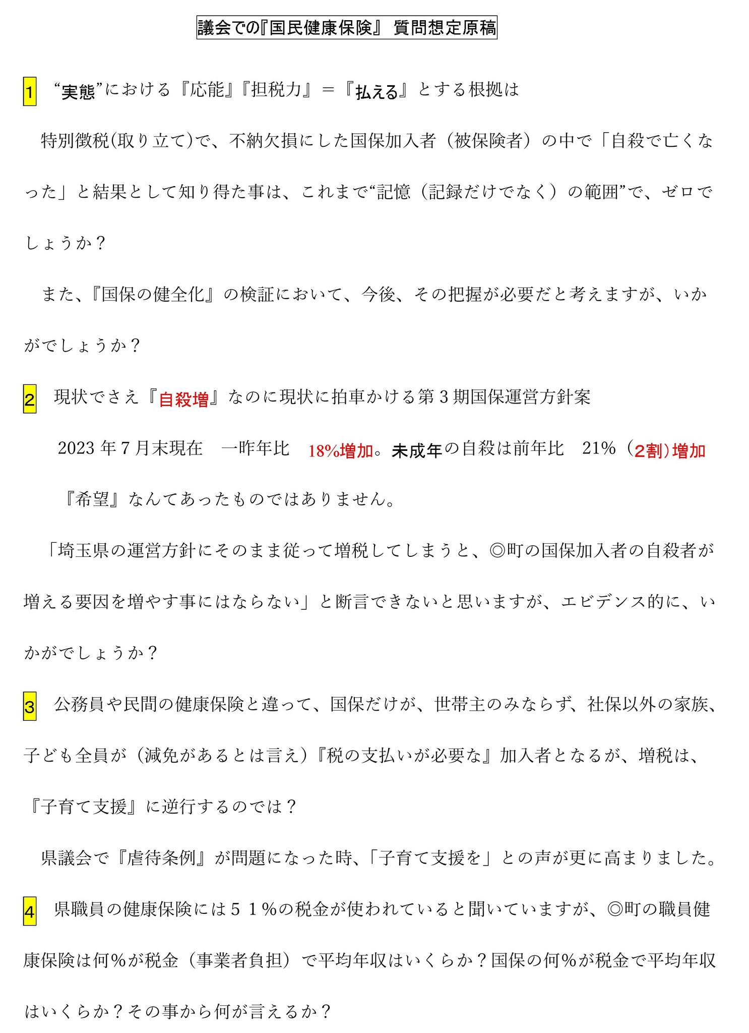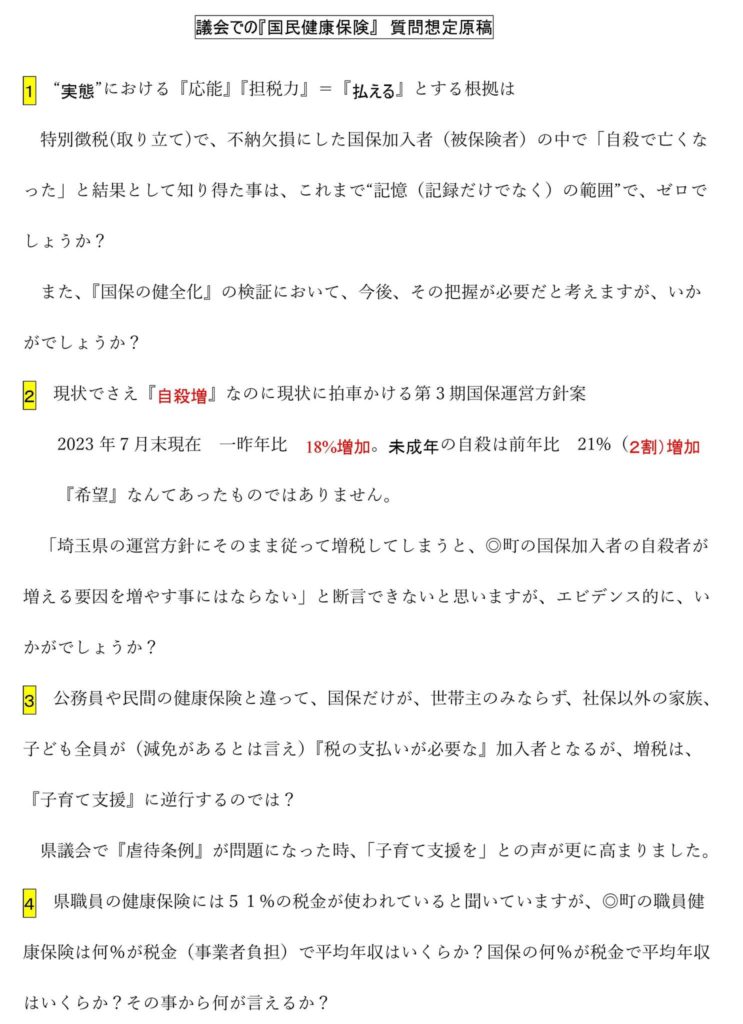 私は市議16年間で、ずっと『国民健康保険』の担当委員をさせて頂きましたが、今後『増税』が強まる今、市町村議員だったら、今の私の立場よりプレッシャーが強いと思い、今日この後、学習会で冒頭私からこの資料をもとに「私が議会で一般質問・議案質疑するとしたら?」を想定して、お話させて頂きます。