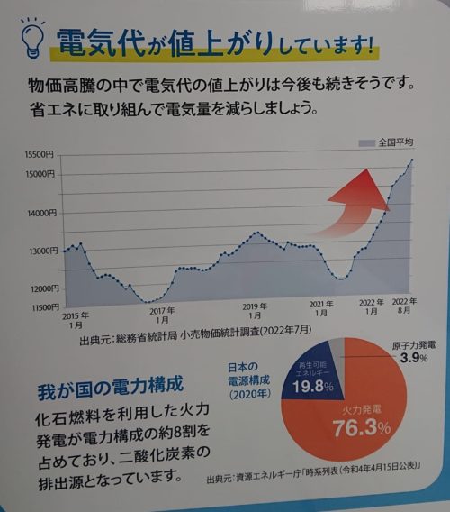 温暖化対策が大変不充分な日本国の省庁が作ったグラフ。⇩これを作っても、行動に結び付いていない。税金で電気代を下げている分があるので、それを含めてはグラフに書いていない。県庁も気にしてはいないだろう(県『省エネ』住宅フェアに私は11~4時までいたが県職員を見掛けていません。課長は冒頭来たようですが)。『ゆでガエル』の状態。「気にする」とは『居ても立っても居られない状況』の事で、努力ではない。自分たちの世代は逃げ切れたとしても若い世代は逃げられない。危機意識が実行に結び付くように、しようと思います。市内企業経営者のある方から、世界のエネルギー政策の状況に困っていると先日お話頂きました。若い議員・職員にも危機感があると思えていない。思えるようにしていきたい。自分が仲間と動いて、賛同者を増やし。