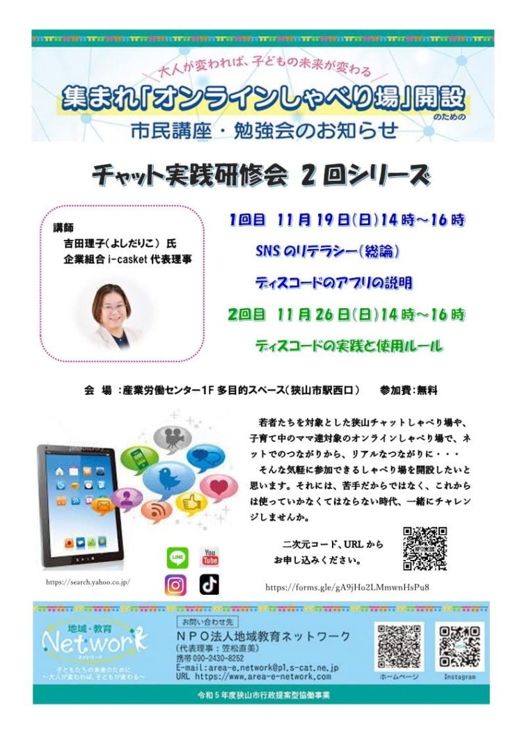 吉田さんの次回講演は、チャット実践研修『ディスコードの実践・使用ルール』26日(日)2時~産業労働センター(狭山市駅西口すぐ)にて(⇩下記詳細)。