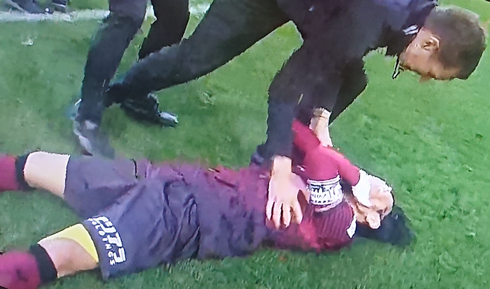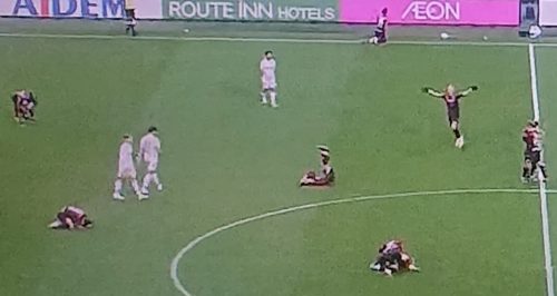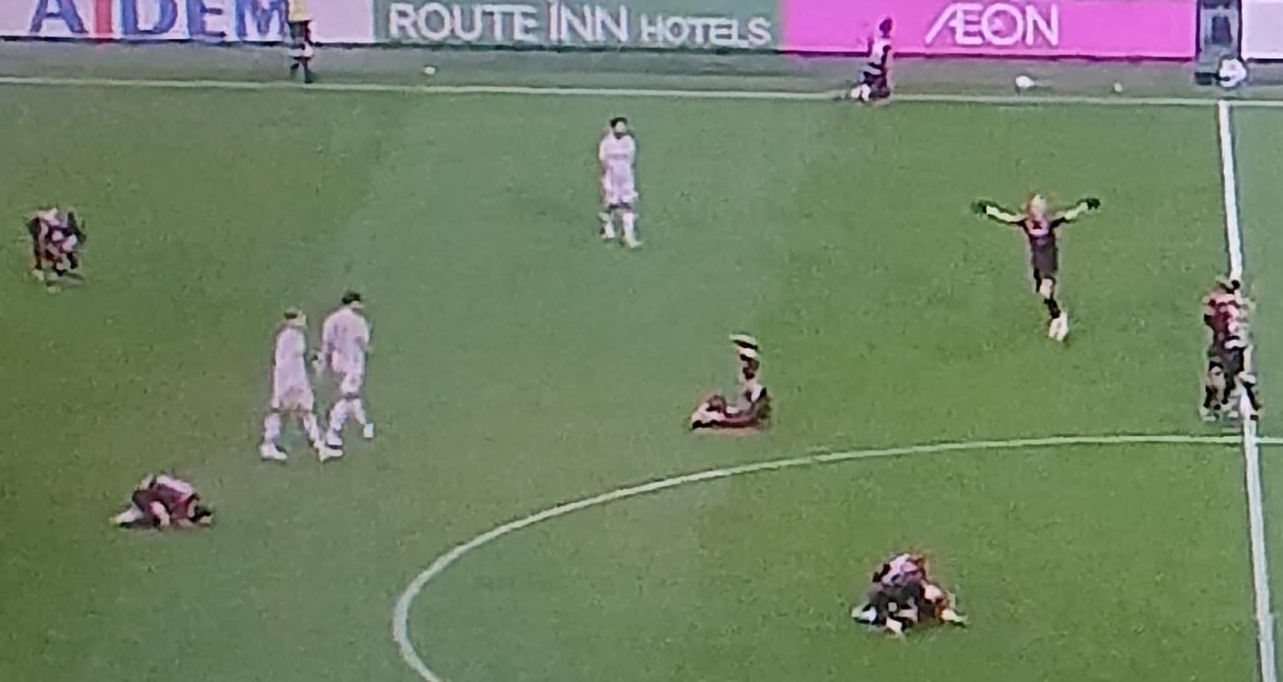(初優勝が決まる試合終了ホイッスル直後、倒れこみつつ、天をあおぐ山口選手)