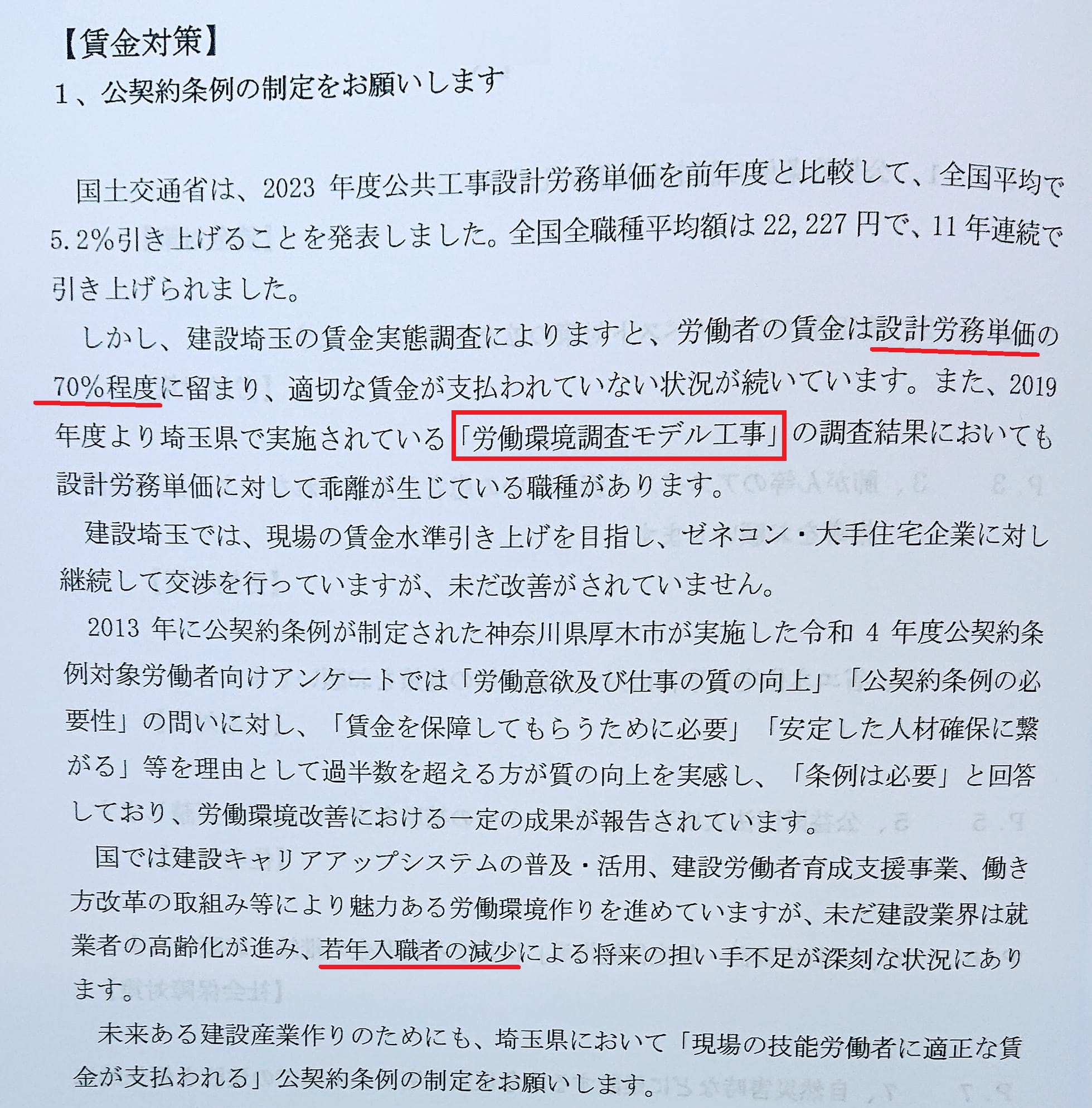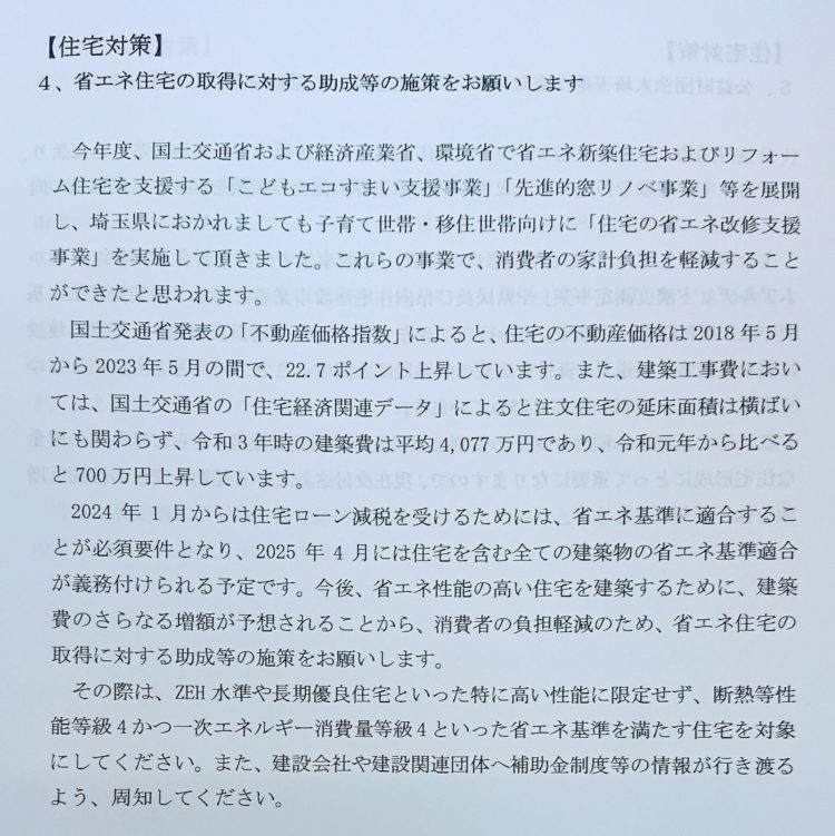労働組合から県庁に頂いている『省エネ住宅』要請書。