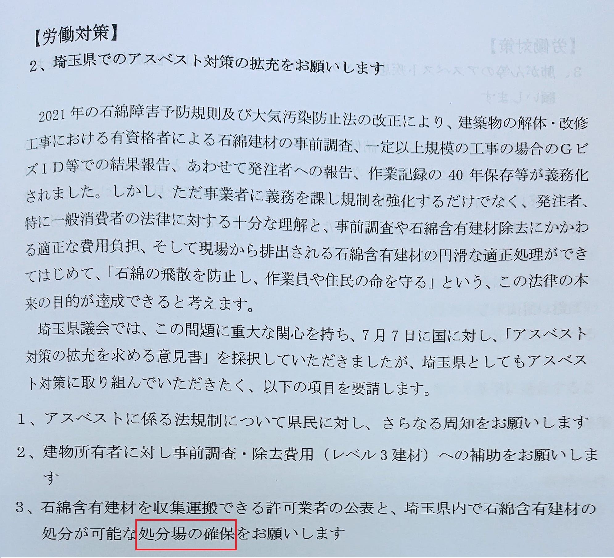 私は市内を周っていて、空き家は以前からですが空き地が少し目に付くようになり始めたと感じています。50年ほど前に建てられたマイホーム達の解体のピークが始まりつつある中、最大のピークがいつなのか。それに伴って、アスベスト建材の処分場を埼玉県は持っておらず、そうでなくてもガソリン代が高騰する中、他県まで持って行く運送費は、支払われているのか。