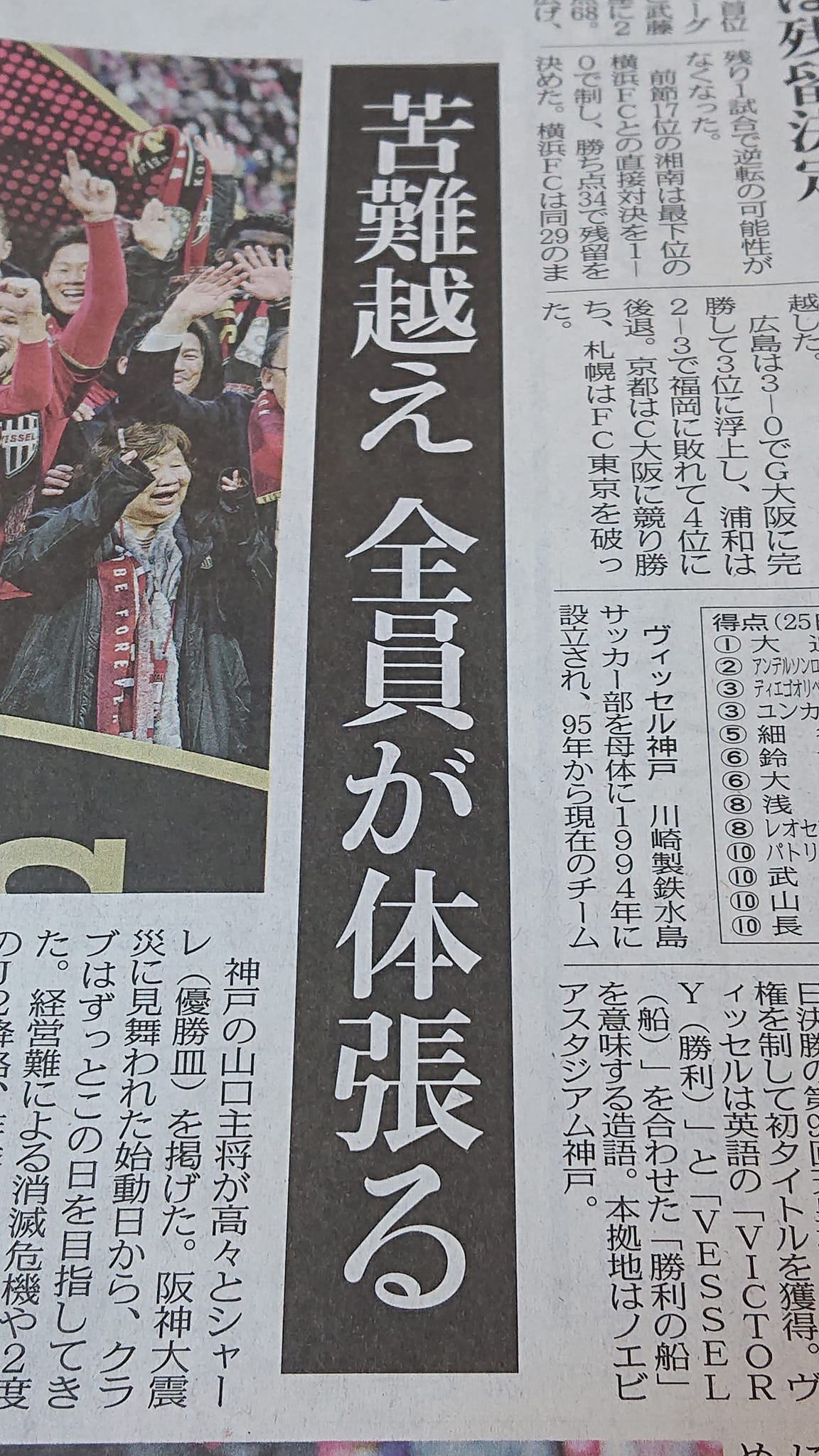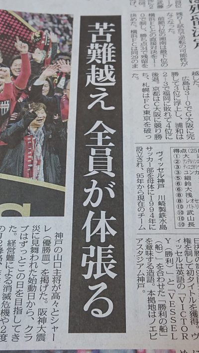 (📷️写真は東京新聞。⚽ヴィッセル神戸J1初優勝の記事👍️)