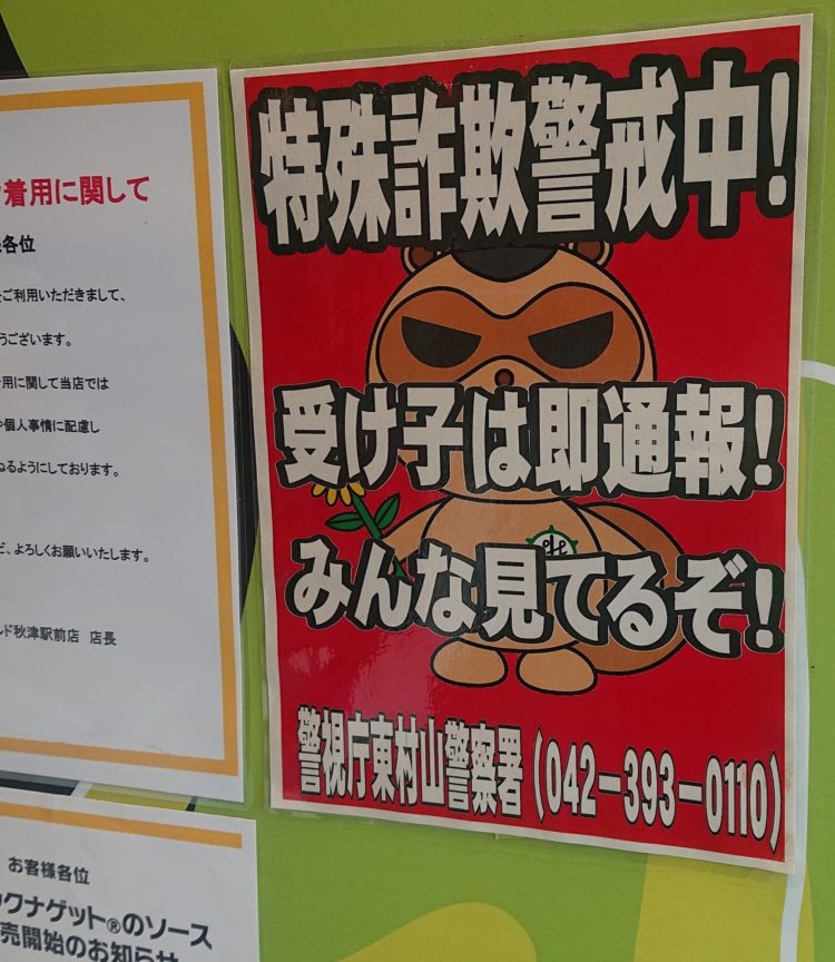 東京都内の🍔ファーストフード店で📷これ⇩を見かけた直後、県内の同ハンバーガー店に行ったところ、ポスターは無かったので、県警察本部の管理職にすぐ電話し、🍔FF店などで同じ取り組みが出来るようお願いしたところ早速、警察本部と狭山警察署で実施に向けた作業を始めたとの事。