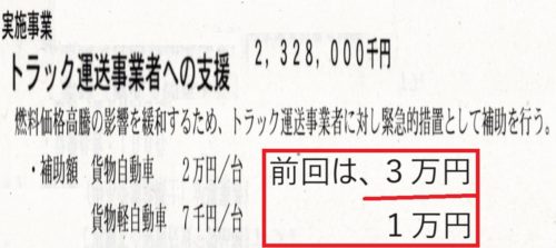 市内⛽ガソリンスタンドの方に一昨日もお話を伺ったところ、原油価格が下がろうとしているとの事。円安傾向でもありますので、1番キツいのは当面『今』だと考え、効果的な対策を皆さんと行っていきたいです。書いてありますように、前回より減額です。運送業は優先すべき課題だと思うのですが(シングルママさんの多い職場でもありますし。前述)。 (後ほど解説を新たに書きます。赤枠内は私のメモです)