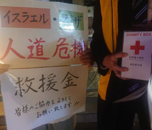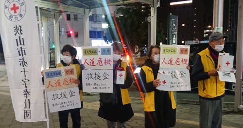 ガザ募金 18人の赤十字ボランティアと、学生さん4人+先生、市長・市職員2人で、狭山市駅西・東口で5時半~。