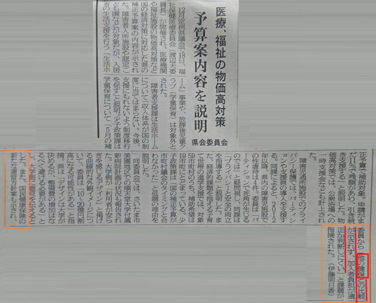 県庁は事実ではない答弁をしている。与党の県議が「民間と公務員の健康保険と、国民健康保険の今後の統合に向けての事だと思うが」と質問したのに、それは事実ではないのに否定をしない。専門家に聴いたところ「国は検討もしていないどころか、逆に生活保護の医療費を国保に押し付けようとしている」。生活保護世帯は当然、病気の人がとても多く、その医療費が国民健康保険加入者の負担にさせようとしている。どうして公務員の健康保険は検討の対象外? ↓これは以前から報道されています。