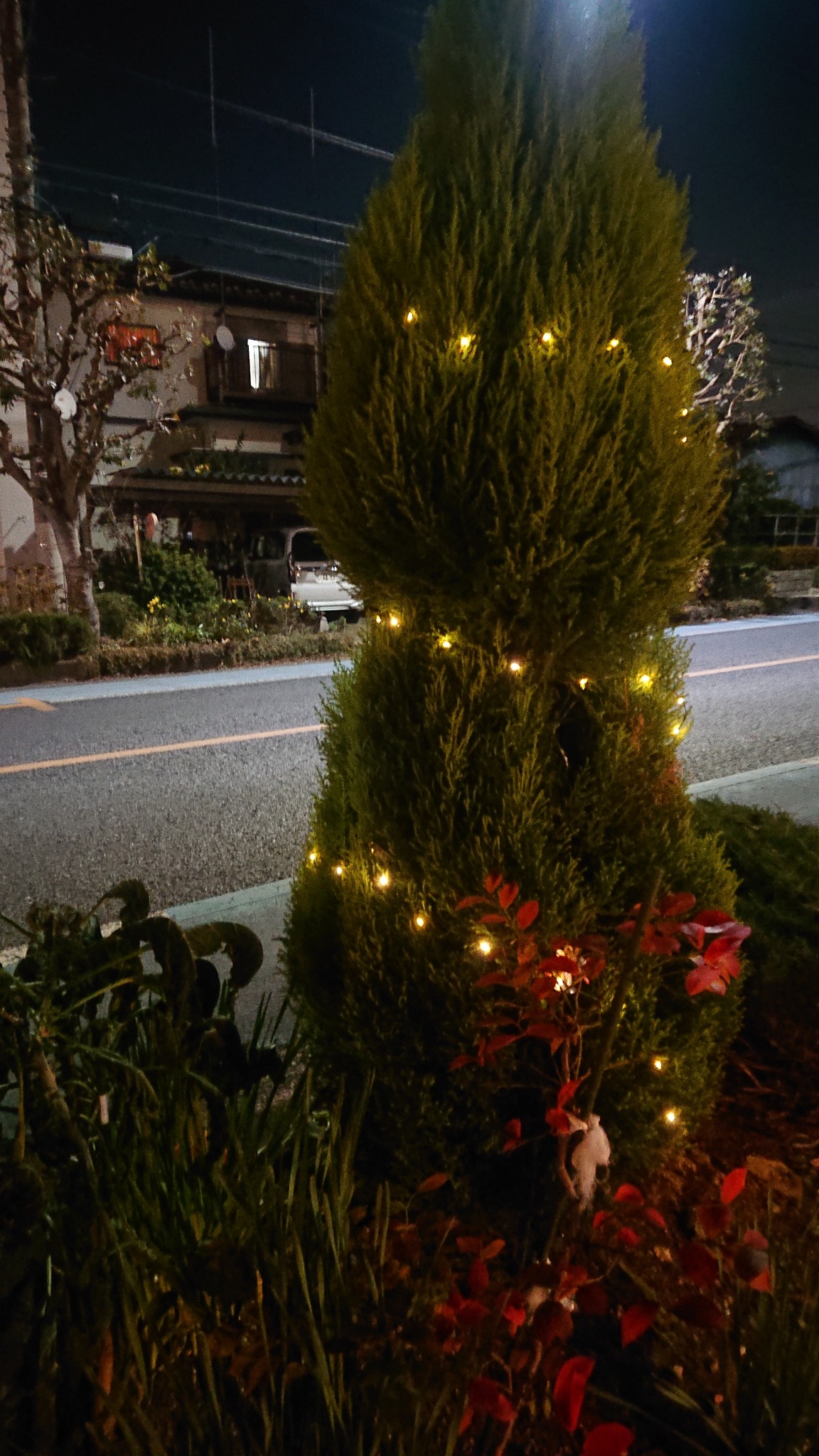 駅前でなく、道路の植樹帯に市民の方が木を植え、電源の無い所ですが、まるで🎄ツリーのように💡ライトアップ。🌠願い事をしてしまいそうです(ちーちゃん👧の事を)。