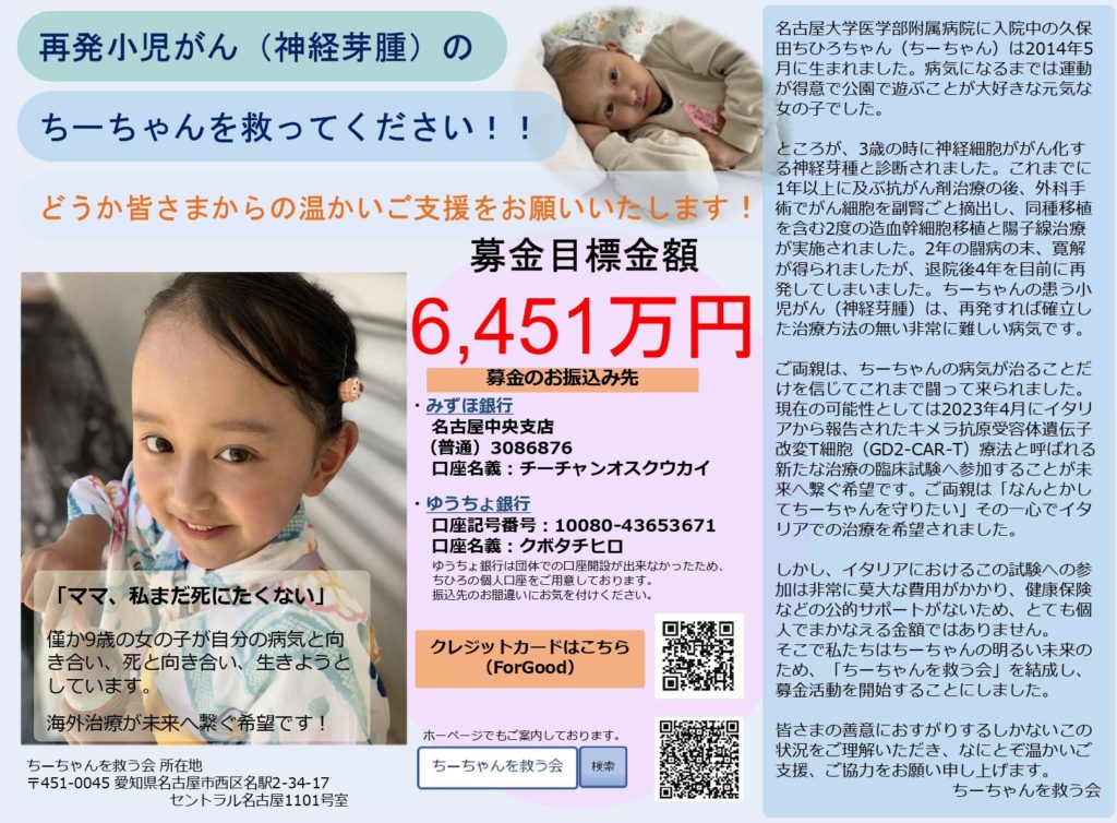 再発小児がんに打ち勝つチャンスを!海外治療でちーちゃんの未来を繋げたい!-for Good!