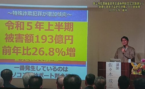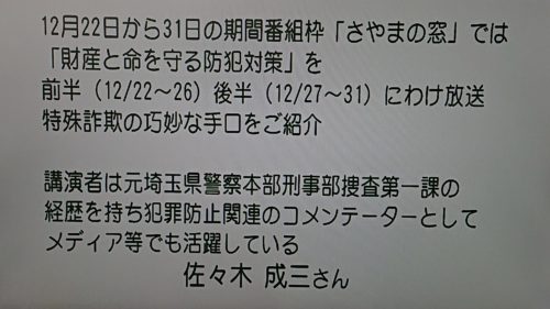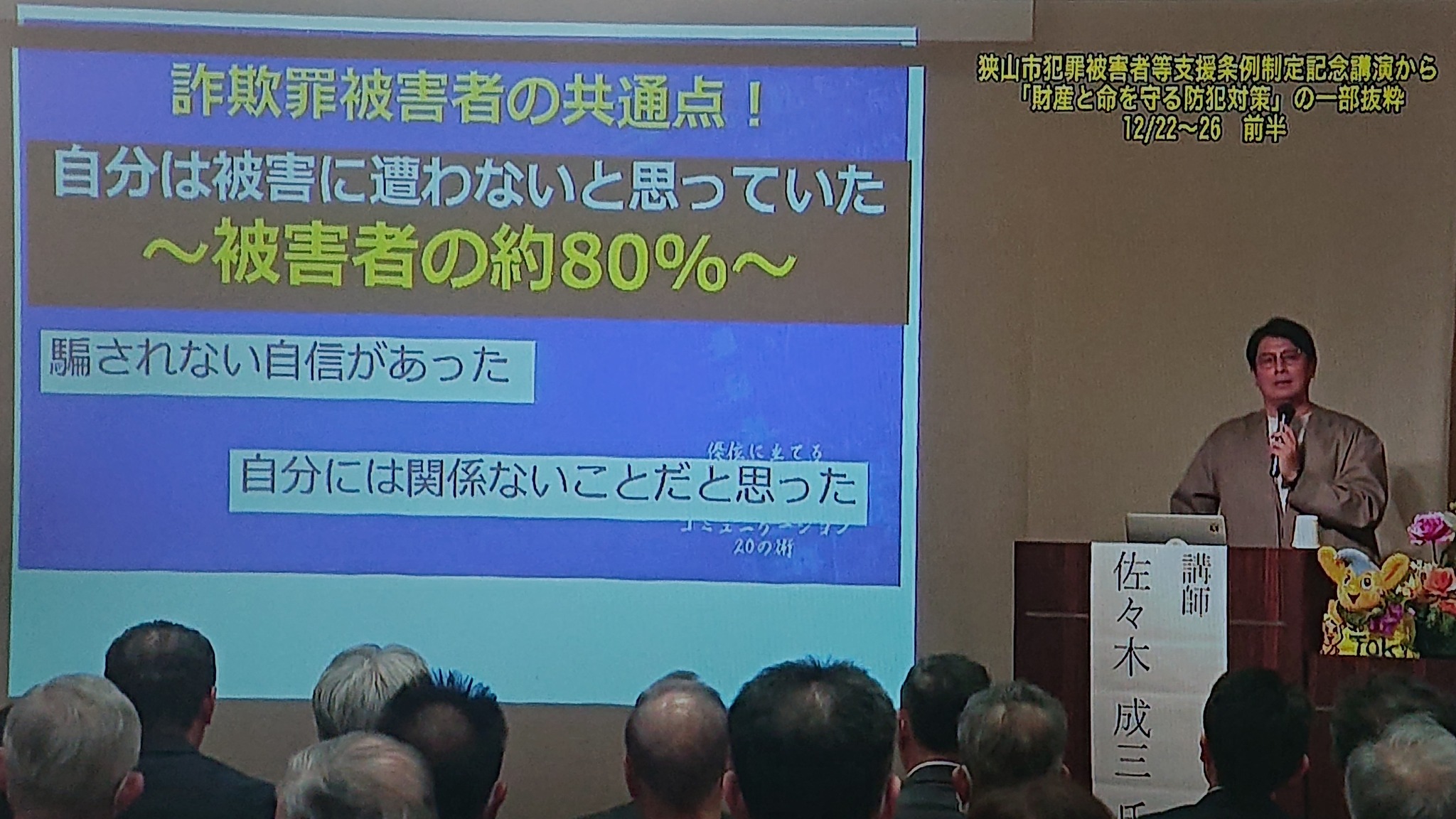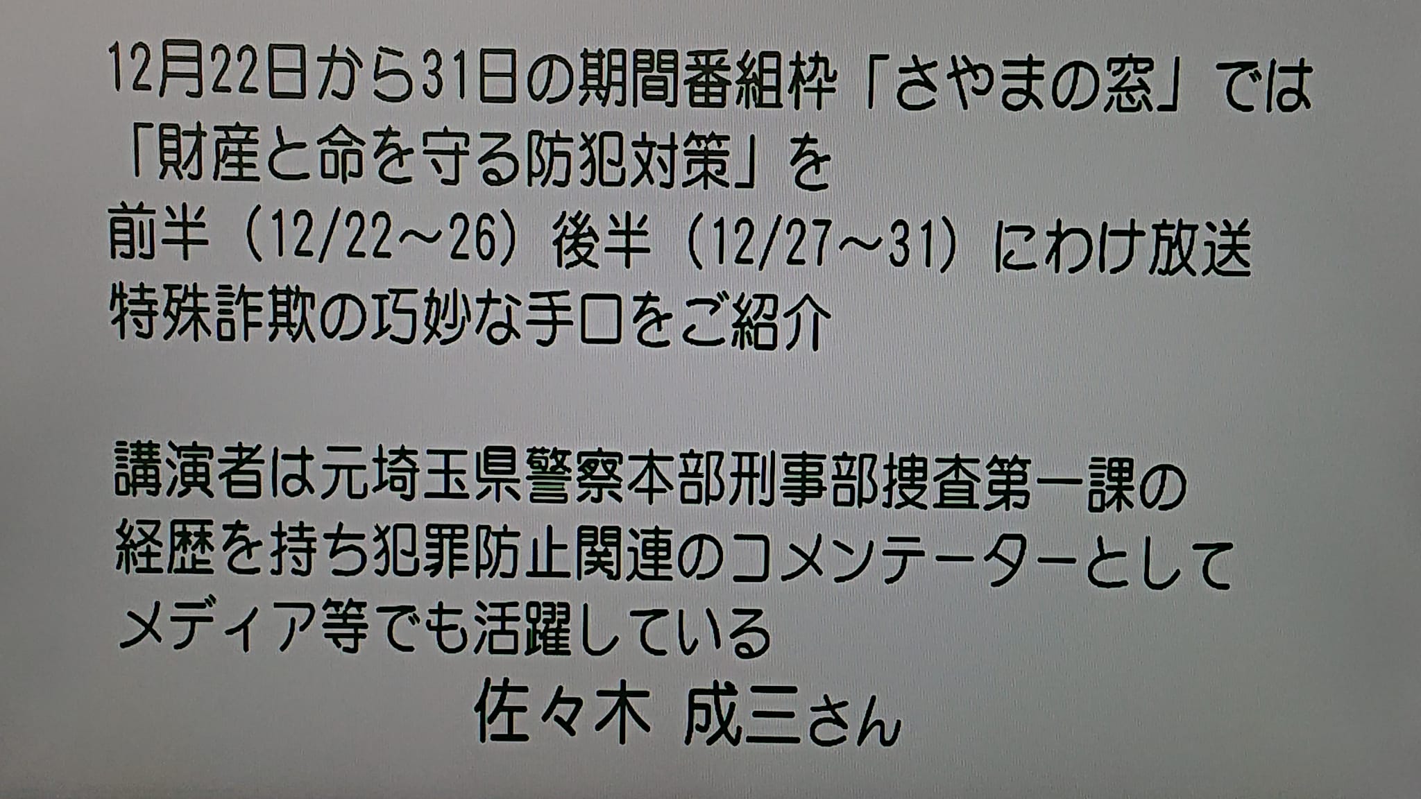 年末必ず増える『詐欺』 TVでおなじみの元埼玉県警 佐々木成三さんが、📺狭山ケーブルTVのご配慮で特別番組で『さやまの窓』の時間に放送。「●●と言うのは全部・100%・絶対詐欺」と断言します。「今年被害は400億円を超えると言われている」と放送。番組欄をご覧下さい。前半は明日(火)までで終わっちゃいます。番組欄で確認頂き、忙しいと思うので録画してご覧下さい。前半は明日(火)までで終わっちゃいます。