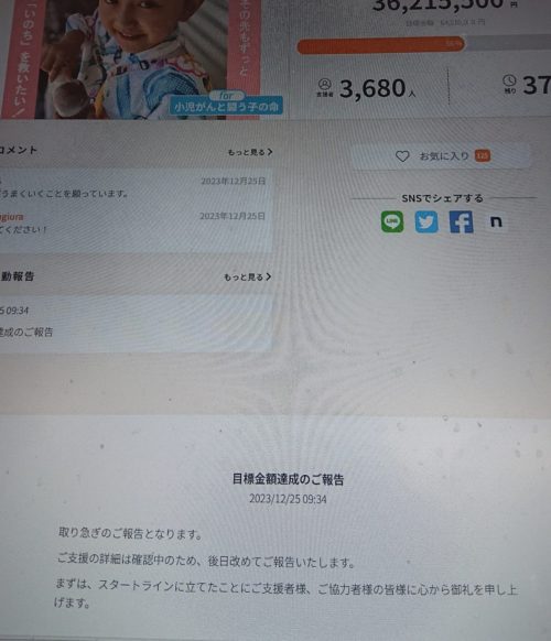 🎄クリスマスの朝に「目標額に達した」と表記が🎅。💛関心を示し、ご協力下さり、ありがとうございます☺