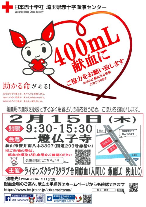 献血 15日(木) 狭山市笹井にて