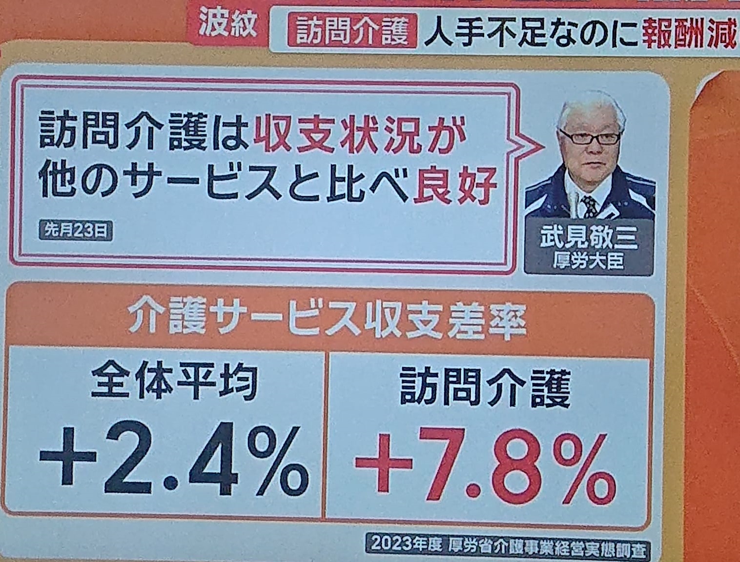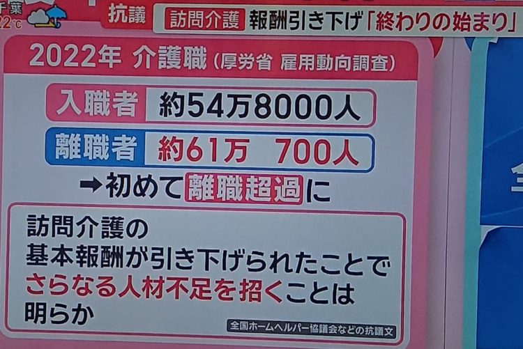 まず、介護保険の予算の中だけで、介護職員の処遇を、他の業種に近付ける改善は、絶対ムリです。 (写真はテレビ朝日2月20日放送)