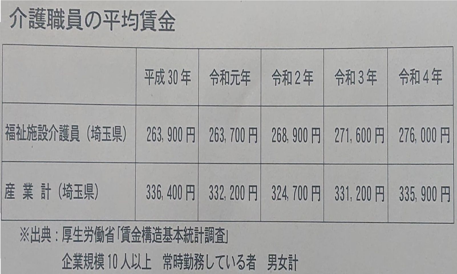 全国の産業統計(前述)では、介護職以外の月収は、この4年間増えていますが、このデータでは増えていません。