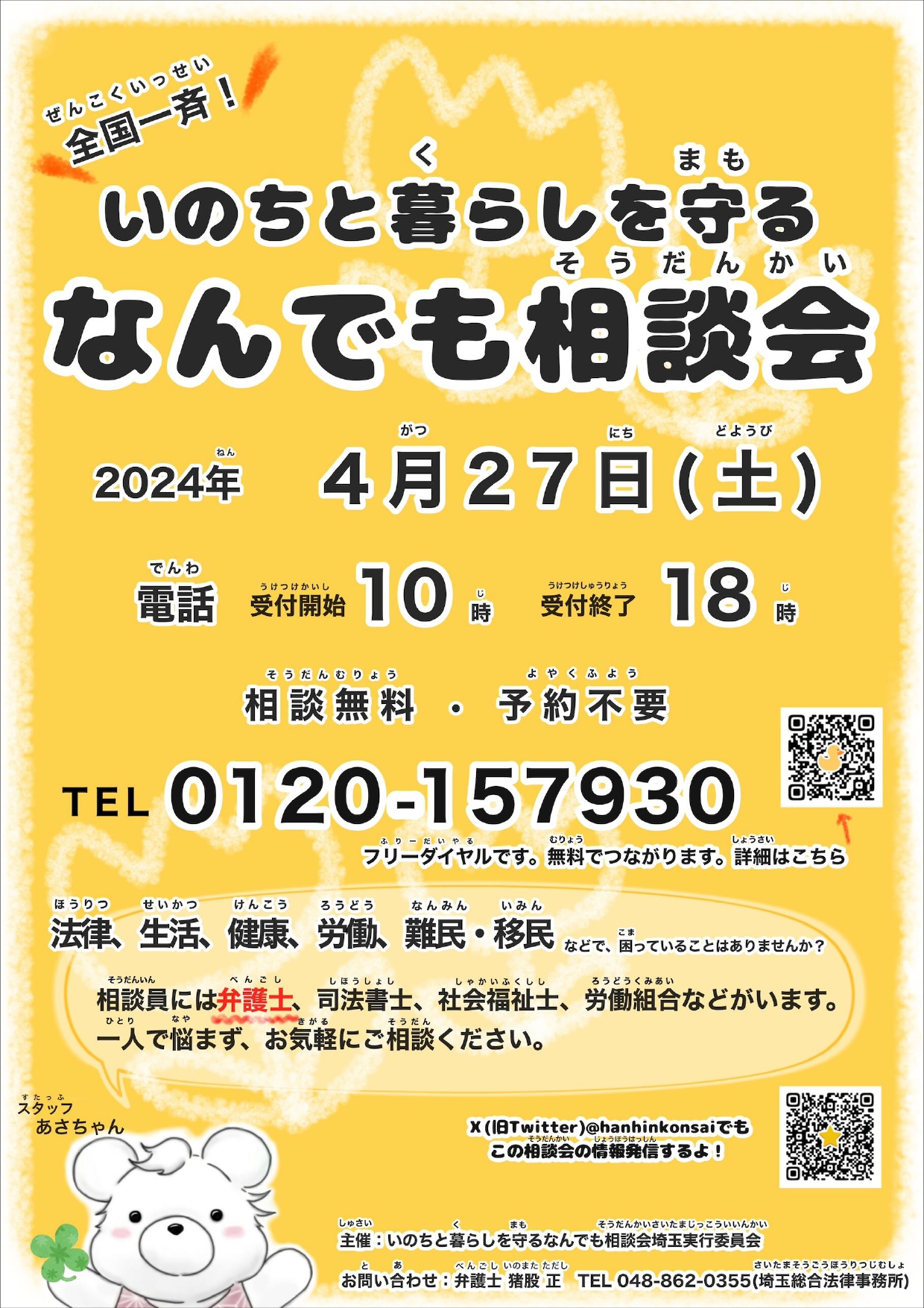 2024年4月27日(土)の電話相談は、全国どこからでも、10時~18時まで、受け付けます。―いのちと暮らしを守る なんでも相談会