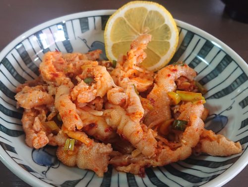 『もみじ』は、鶏の足で、コラーゲンたっぷり💛。辛いのが得意ではない私でもOK。このメニューは、夜か“昼飲み”(『昼のみ』でなく