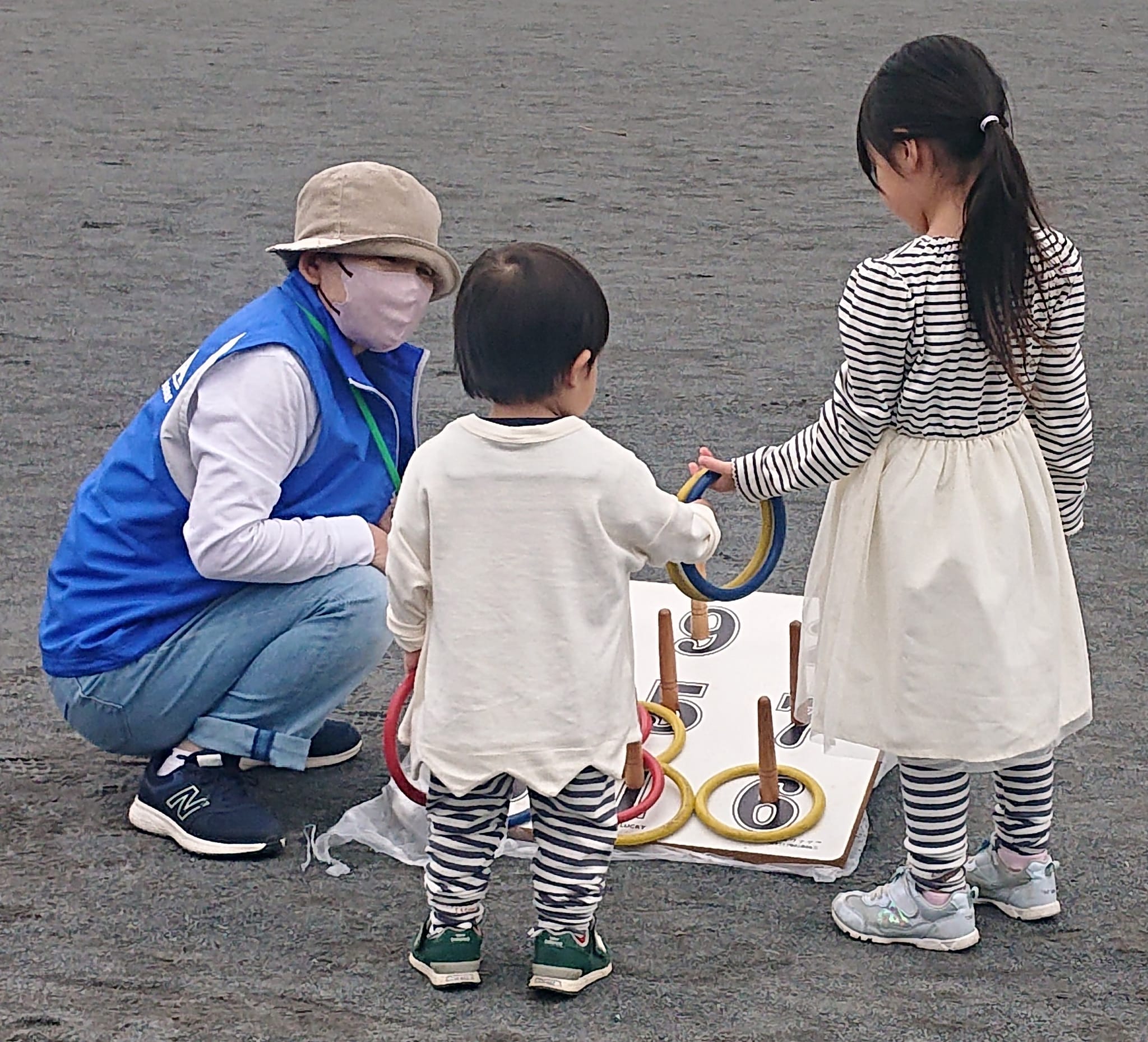 『輪投げ』を👧お姉ちゃんがやってるのを見て、下の子は、投げる事は出来ないけれど、一生懸命、輪を全部入れていました(📷️なぜか2番の所が好きで、輪のほとんどを2番に(^O^)。どこでもいいんだよね。おばちゃんが、沢山ほめてくれてるから☺)。