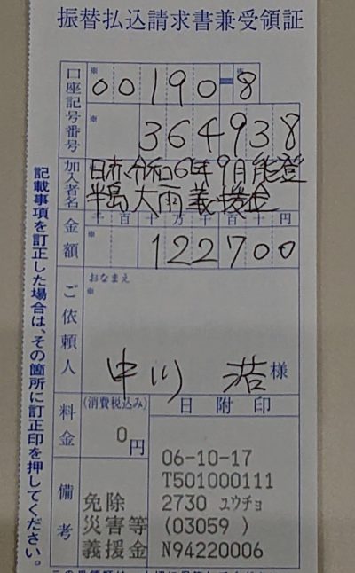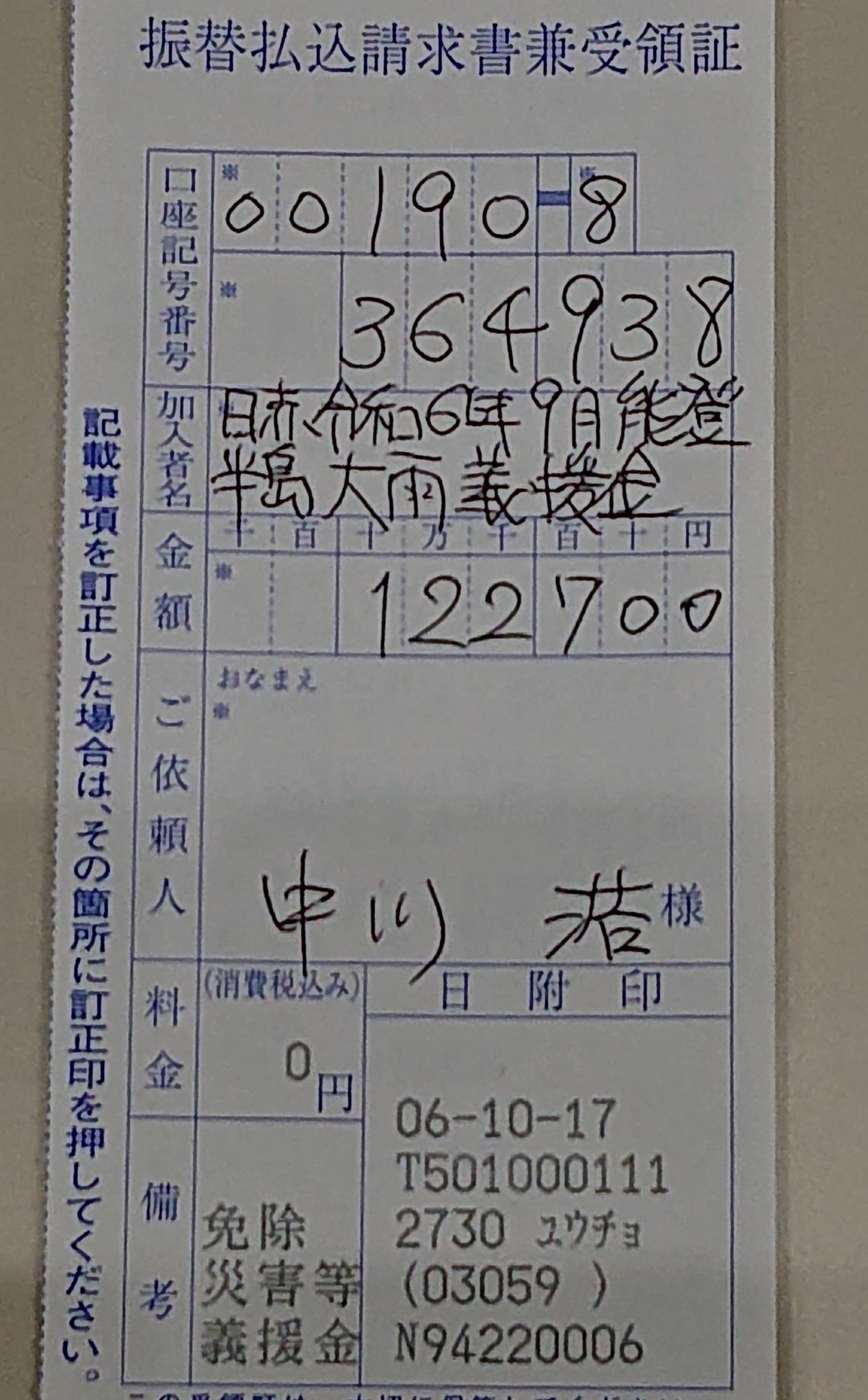 狭山市駅での一昨日(祝)と、ひろし事務所前の募金箱1万250円を合わせ、皆様の代理として、日本赤十字へ今日送金した事を報告申し上げます。事務所前では引き続き、募金箱を設置しております。ありがとうございます。被災された方の顔が思い浮かびます☺。今年中にまた、能登へ向かう予定です。