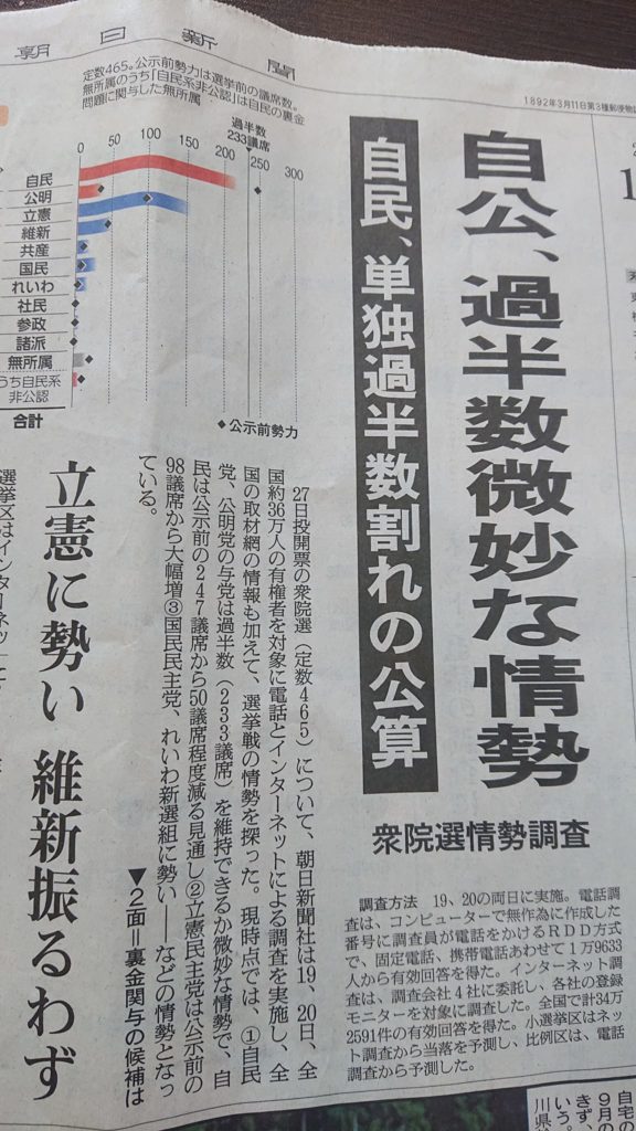 『選挙情勢』に私は一喜一憂しませんが、国民の一部の方は『勝ち馬』意識があり、「政権交代可能」となれば一気に動くので、今日選挙カーで演説し、多くの方に聴いて頂きました。 (📷今朝の朝日新聞)