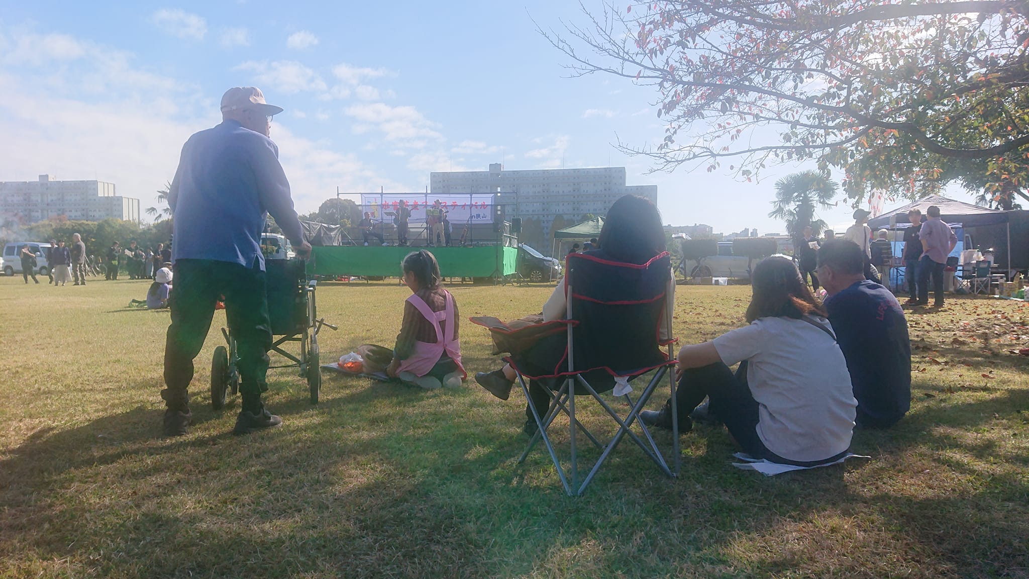 「なんと癒しの時なんだろう」と思い、パチリ。私の親族も、カートを押さないと歩けなかったりしますが、『機会』があればこうして『出掛けようと思えます』よね。会場設営の皆さま、ありがとうございました。そして木陰があるお陰です。(「倒れたら危ない」と今後色んな所で切ってしまうかも知れないけど)