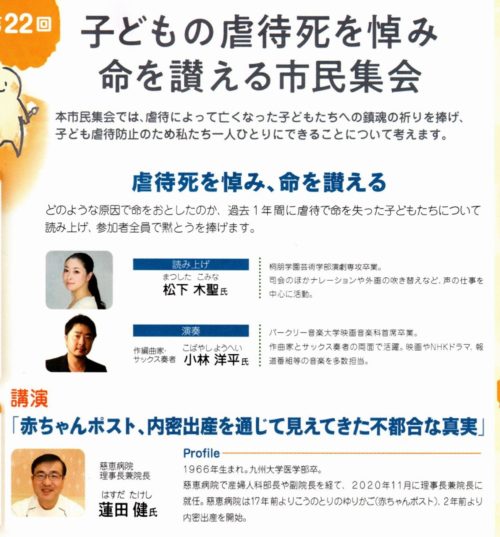 (慈恵病院に行ったり、蓮田先生のお話を伺うのは3回目。当然どんどん深刻な話に。たまたま『オレンジリボン』バッジを購入した袋に講演チラシが入っていた事により知り、県庁にもこの講演会を伝え、内容について意見交換しています。県庁が来たかは存じません。昨日(日)『第22回 子どもの虐待死を悼み命を讃える市民集会』にて。)