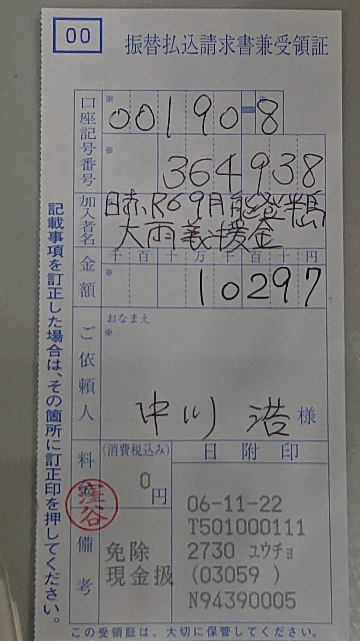 ひろし事務所前の募金箱で最近お預かりした1万301円を、皆様の代理として、日本赤十字へ本日(金)送金致しました。年末年始に向け、事務所前では引き続き、募金箱を設置しております。ありがとうございます。今年中に再度、能登へ向かいます。