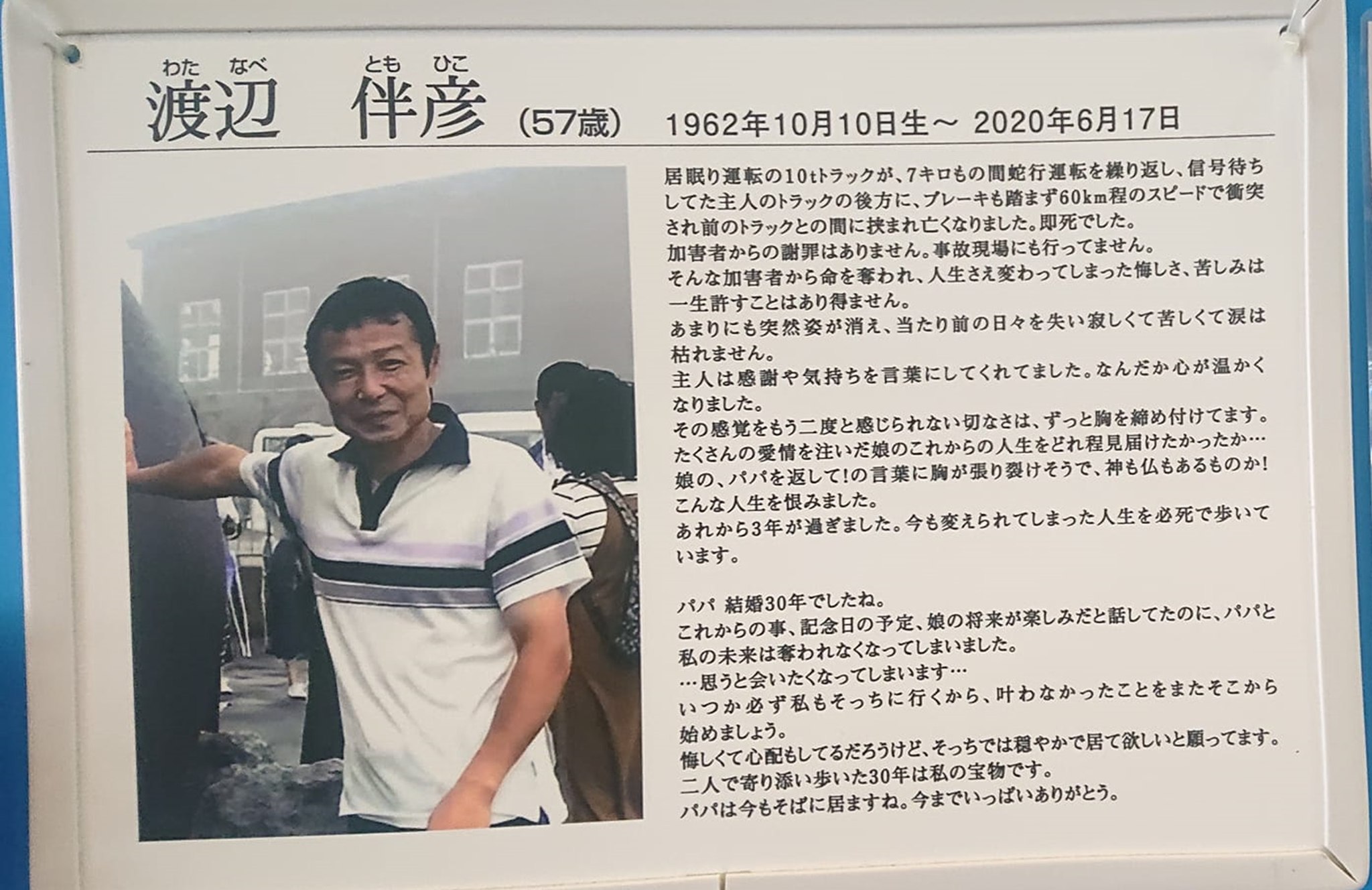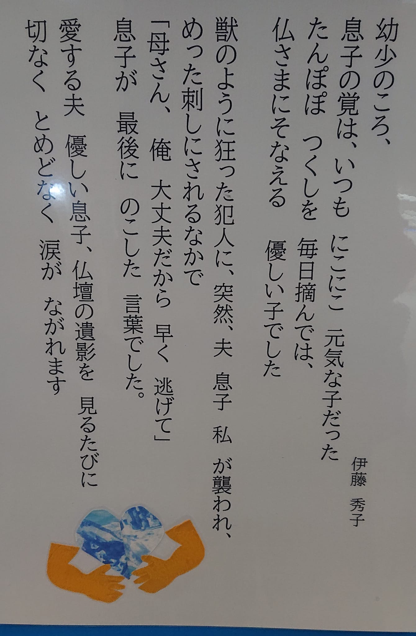 狭山在住(現在)の方が15才の時、両親を『強盗殺人』で殺された『犯罪被害者の会』の展示。ご本人から「両親の写真は残っていない」と教えて下さったので、「“空欄”にも意味がありますね」とお話しました。また、私から会に小さな提案をさせて頂き、早速実行して下さいました😊。会長さんにお話しましたが、私の役割の1つは「(啓発だけでなく)実際の行動に結び付く『結果』を出しやすくする事」です。