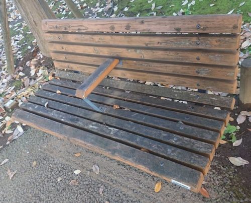 県庁敷地内のベンチ。誰がこんな気を遣われていないベンチに近寄るだろうか。県庁職員で昼食を屋外でとりたい人もいるのに、管理が。県庁には職員の健康だけを担当する部署があるが、機能していない。県庁職員に対してすら。 (当然、一例です。予算の問題な訳無い)