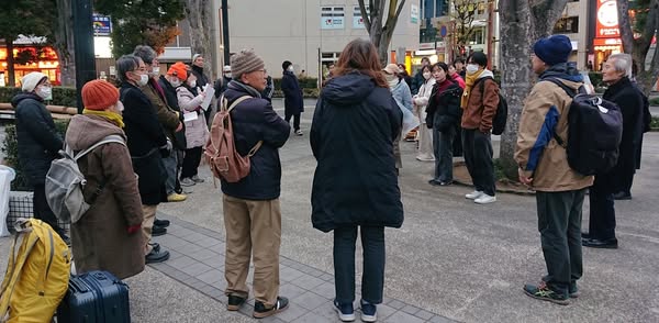 (正月3日、県内『食糧配布・弁護士無料相談会』️片付けを終え、寒い野外ですが、反省会。行政機関は年末年始『9連休』なので、行う事になりました)