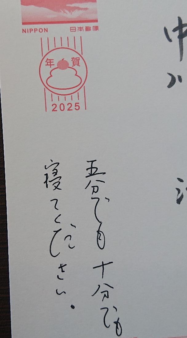 📷差出人の欄⇩に、(^O^)笑ってしまいましたが、ありがたい年賀状を頂きました。私はこの後、いかにも寝不足の顔の写真を出さざるを得ない事をお許し頂き(^^;)、御指摘に少しは従いたいと思います。衆議院選挙前から気付けば2カ月以上、家族と食事をとる事が出来ていませんでした(朝食含め)。私のネットを御覧下さっている方から📷これを頂いたので、御礼申し上げます。ありがと〰️(^O^)/。うれしかったです。差出人欄は、インパクトがありますね(^^)。(落語家 真打の方から)